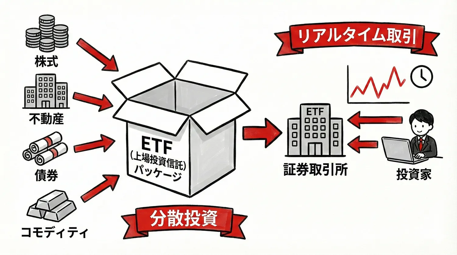 ETF(Exchange-Traded Fund、上場投資信託)は、株式や指数、コモディティなど、特定の資産の値動きに連動するよう設計された金融商品のことです。投資信託と仕組みそのものは似ていますが、証券取引所に上場しており、株式と同じように市場の取引時間中であればいつでも売買できる点が大きな特徴になります。