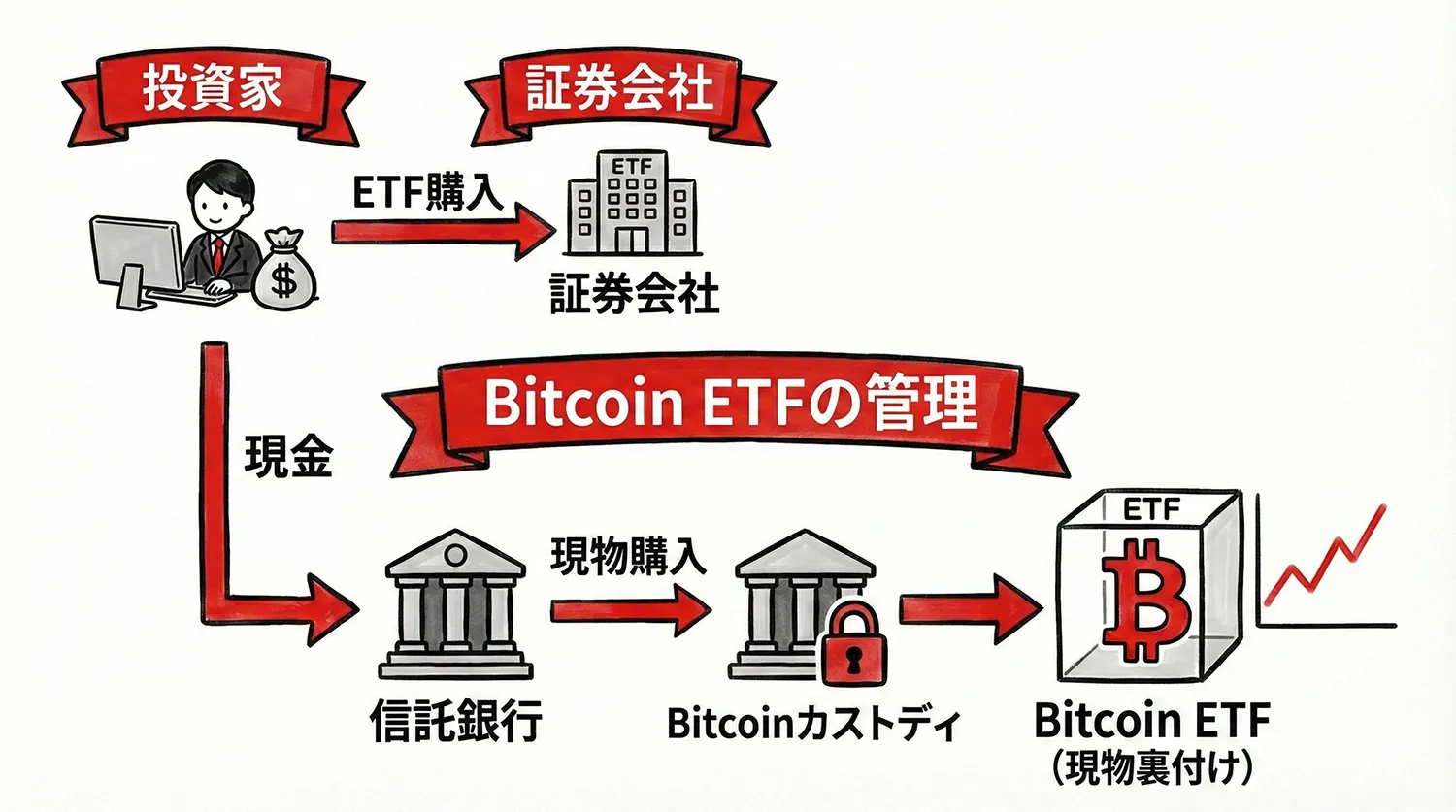 現物型のビットコインETFは、運用会社が実際にビットコインを購入し、専門の保管機関であるカストディアンを通じて管理する仕組みになっています。投資家がETFを購入すると、その裏付けとして運用会社は相当額のビットコインを保有し、ETFの価格はそのビットコインの価値を基準に形成されます。
