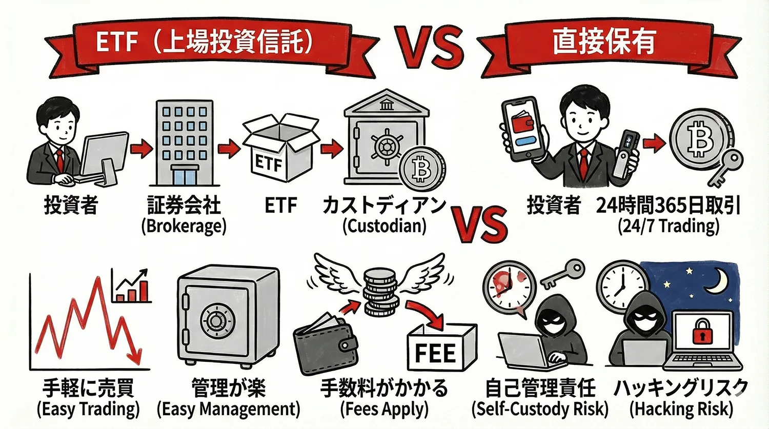 ビットコインETFとビットコインの直接保有には、本質的な違いがあります。両者の仕組みや扱いを正しく理解することは、どのような方法でビットコインに投資するかを判断する際の重要な基準になります。ここでは所有権、コスト、取引環境、実用性といった観点から比較していきます。