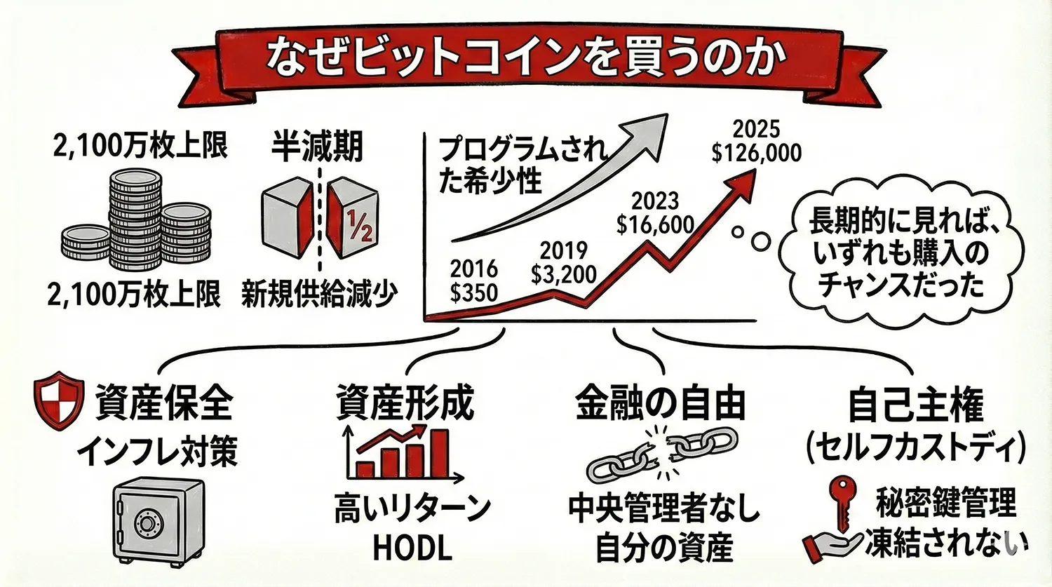 もちろん将来を保証するものではありませんが、長期保有(HODL)は多くの投資家に支持されています。世界的に採用が進むいま、年金の補完や長期的な購買力の維持策として関心が高まっています。