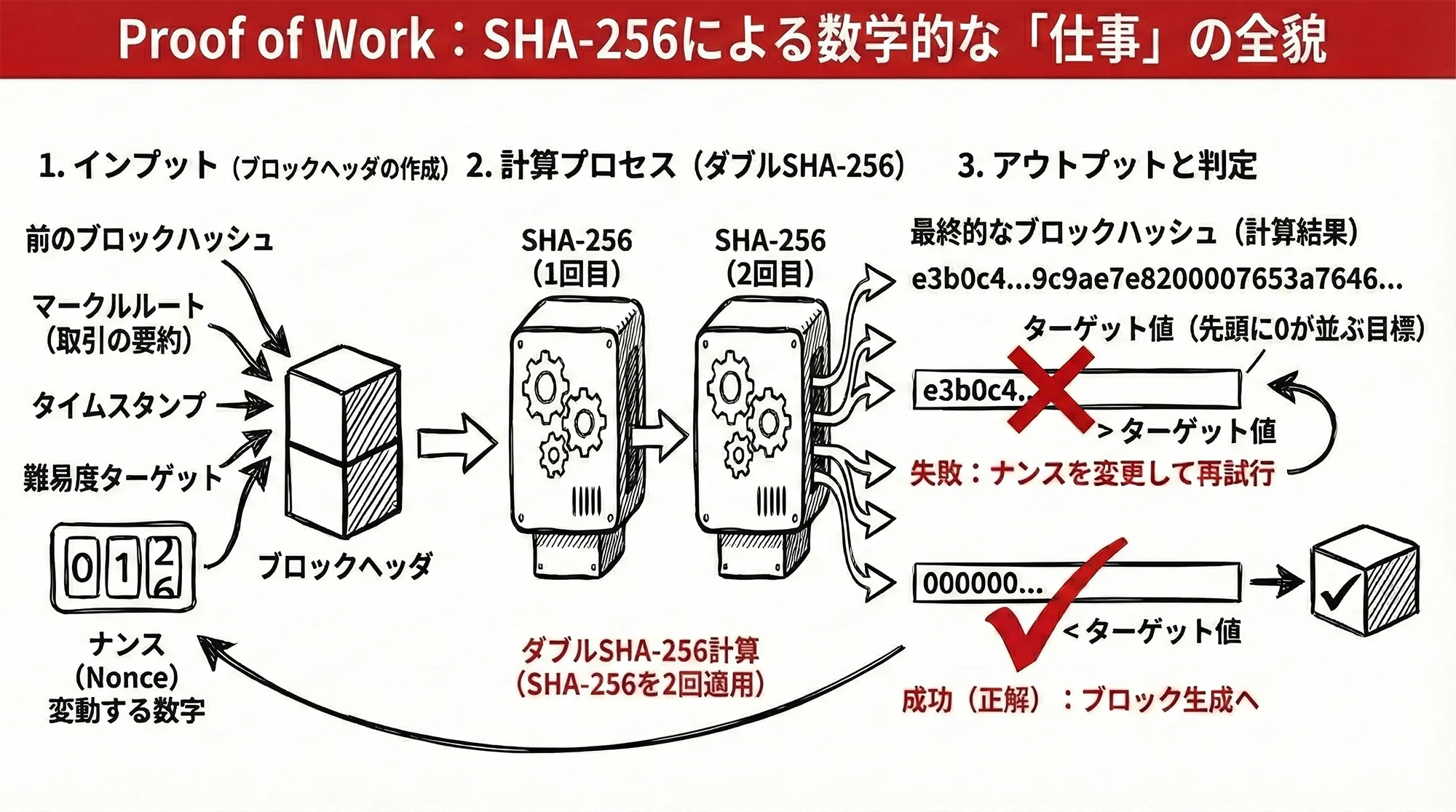 2. 具体的なメカニズム:SHA-256による数学的な「仕事」