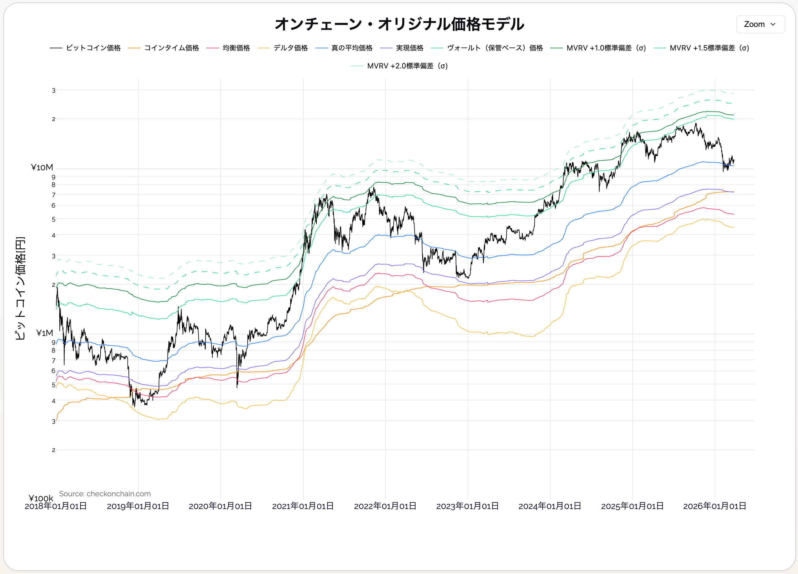 コインタイム価格、均衡価格、デルタ価格、真の平均価格、実現価格、ヴォールト(保管ベース)価格、そして、MVRV±標準偏差のバンドを重ねた多層的な価格モデル。現在の価格が過去のオンチェーンデータと比較して、どの水準にあるのかを視覚的に把握できる。