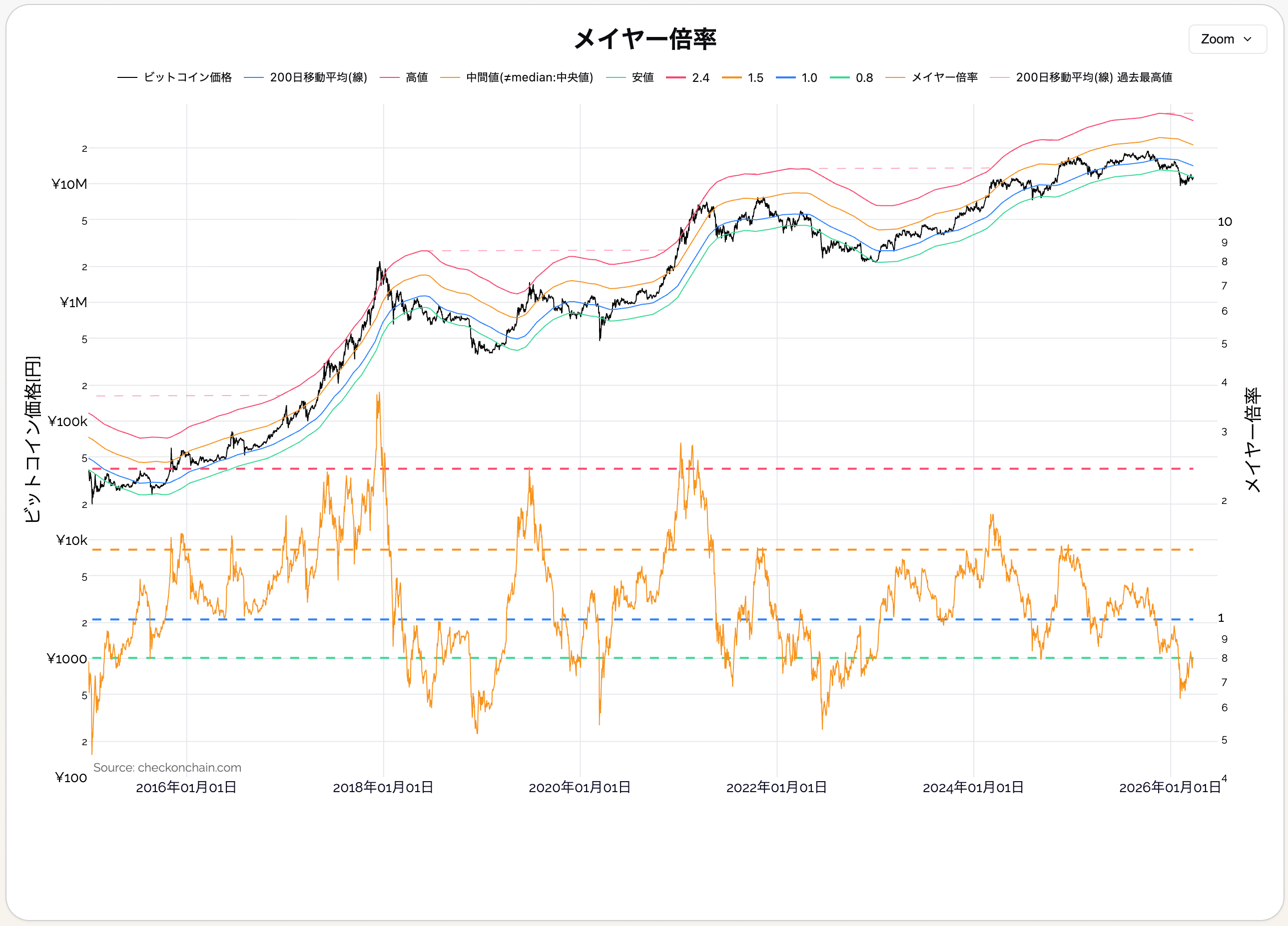 200日移動平均線に対して現在の価格が何倍かを示す指標。歴史的に2.4倍以上は過熱域、0.8倍以下は割安域とされており、サイクルの位置を大局的にとらえるのに有効。