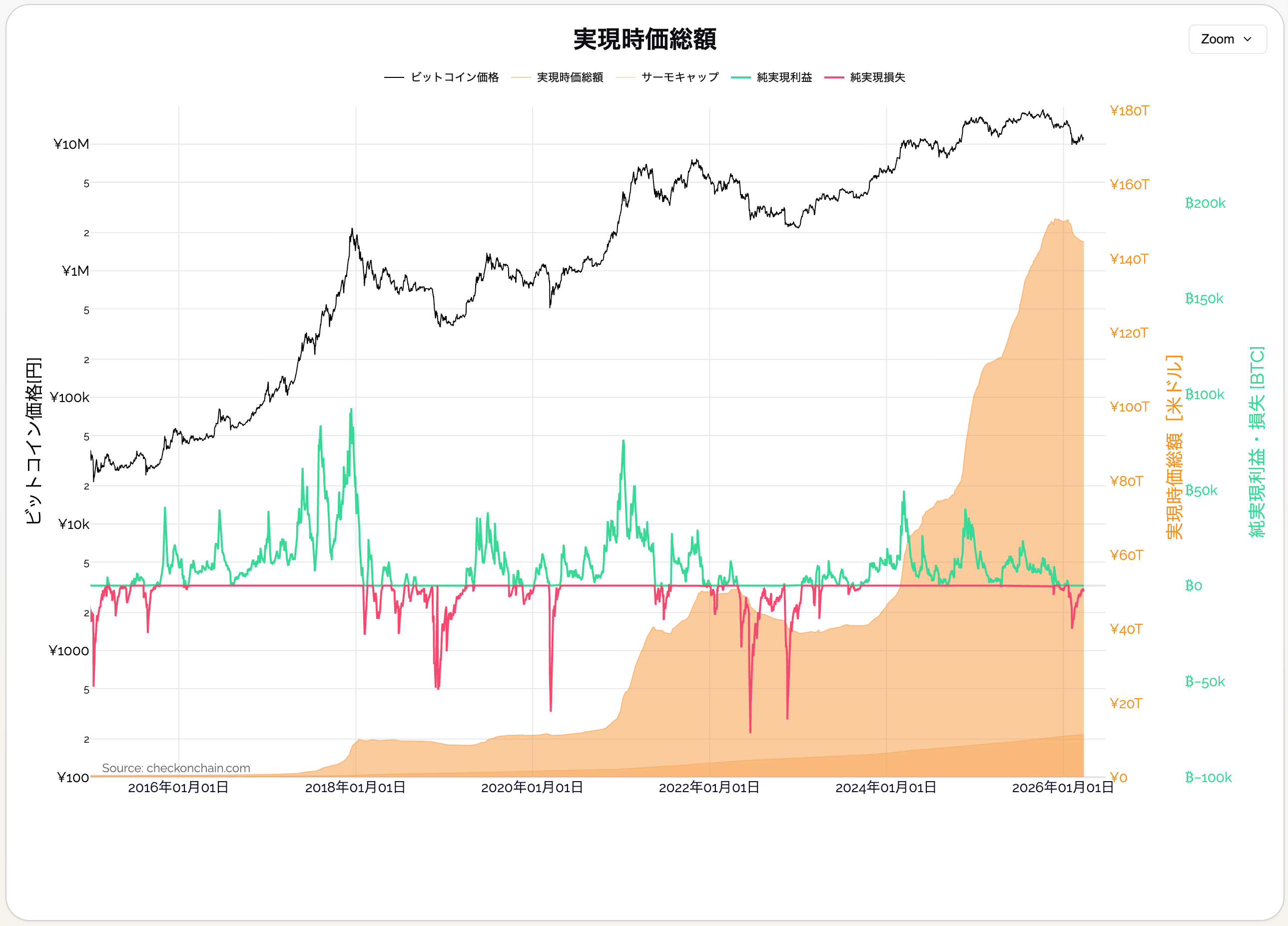 全ビットコインを最後に動いた際の価格で評価した総時価総額(実現時価総額)に加え、サーモキャップ、純実現利益・損失を確認できる。市場参加者のコストベースと現在価格の乖離を把握するうえで欠かせない指標。