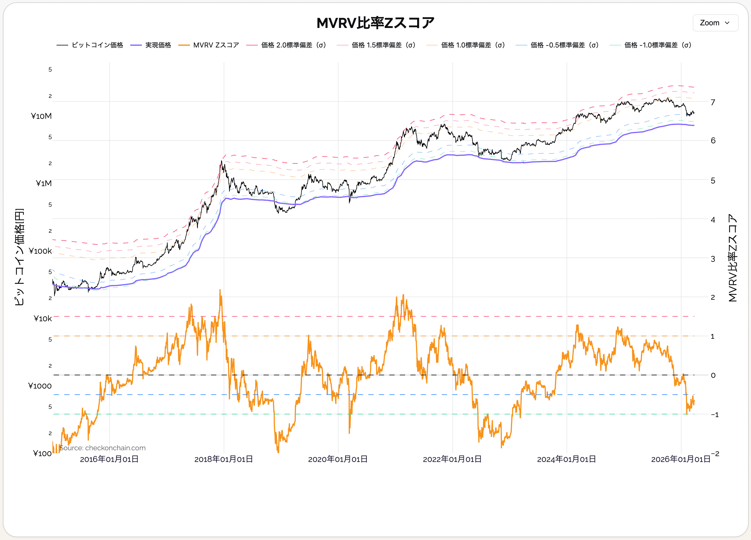 時価総額と実現時価総額の乖離を標準化したスコア。過去のサイクルでは、Zスコアが高水準に達した局面が市場の天井と重なることが多い。現在の位置は標準偏差の範囲内に収まっており、過去の天井圏と比較しながら読めるチャートだ。