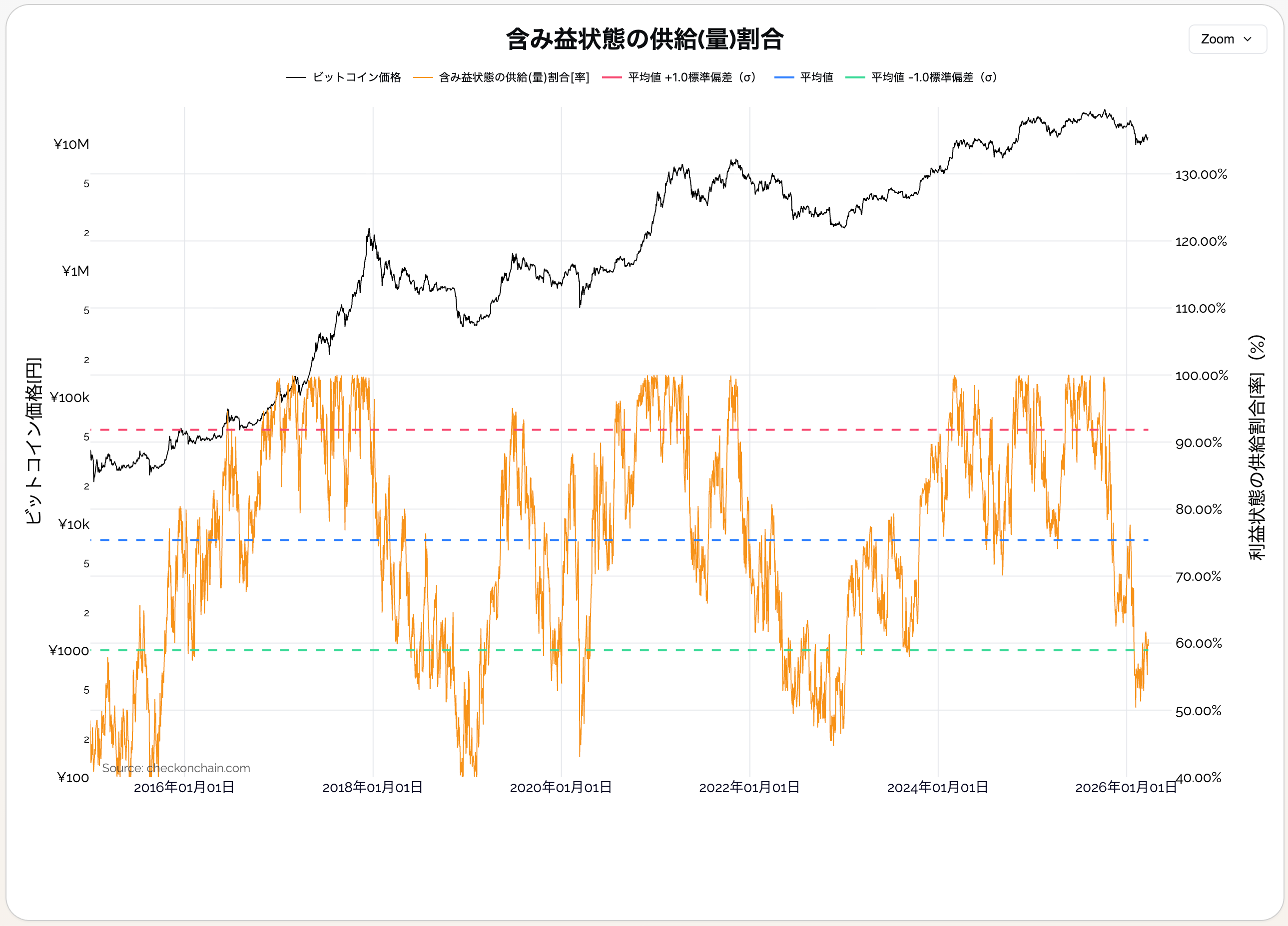 現在のビットコイン供給量のうち、含み益を抱えているコインの割合を示す。強気相場では90%超、弱気相場の底では50%前後まで低下する傾向がある。