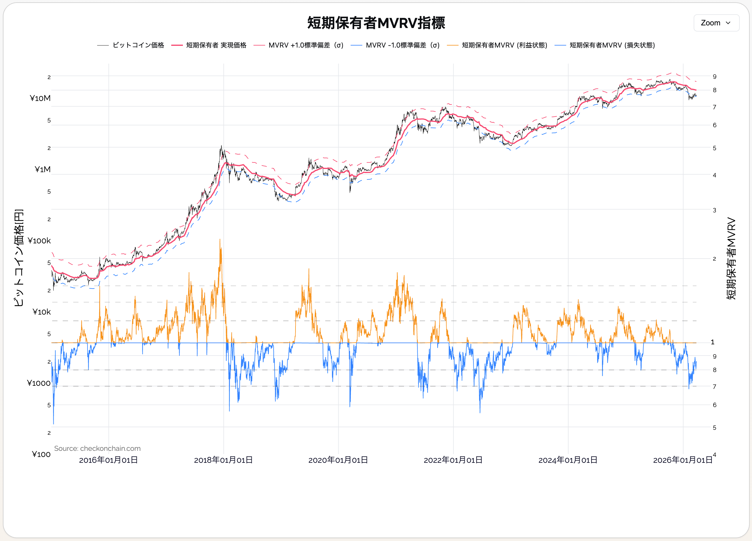 155日以内に取得されたコイン(短期保有者)のみを対象としたMVRV指標。短期的な過熱・売り圧の発生タイミングを読む際に特に有効。