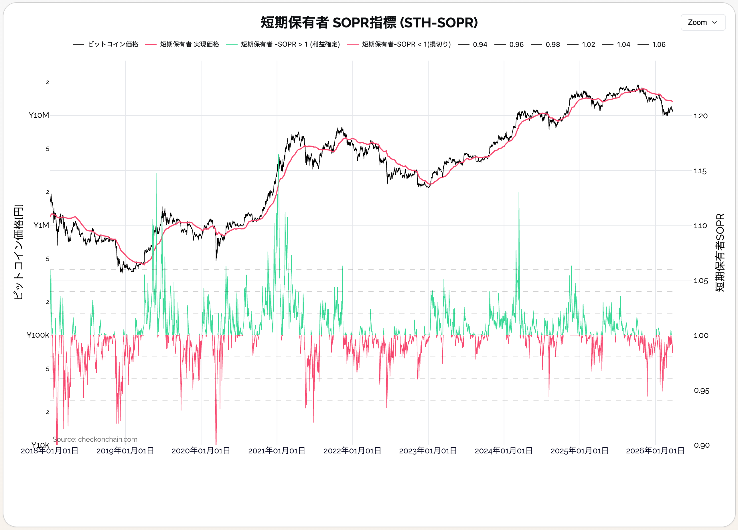 SOPR(Spent Output Profit Ratio)の短期保有者版。1.0を割り込むと短期保有者が平均的に損切りしていることを示し、相場の転換点を探る手がかりとなる。