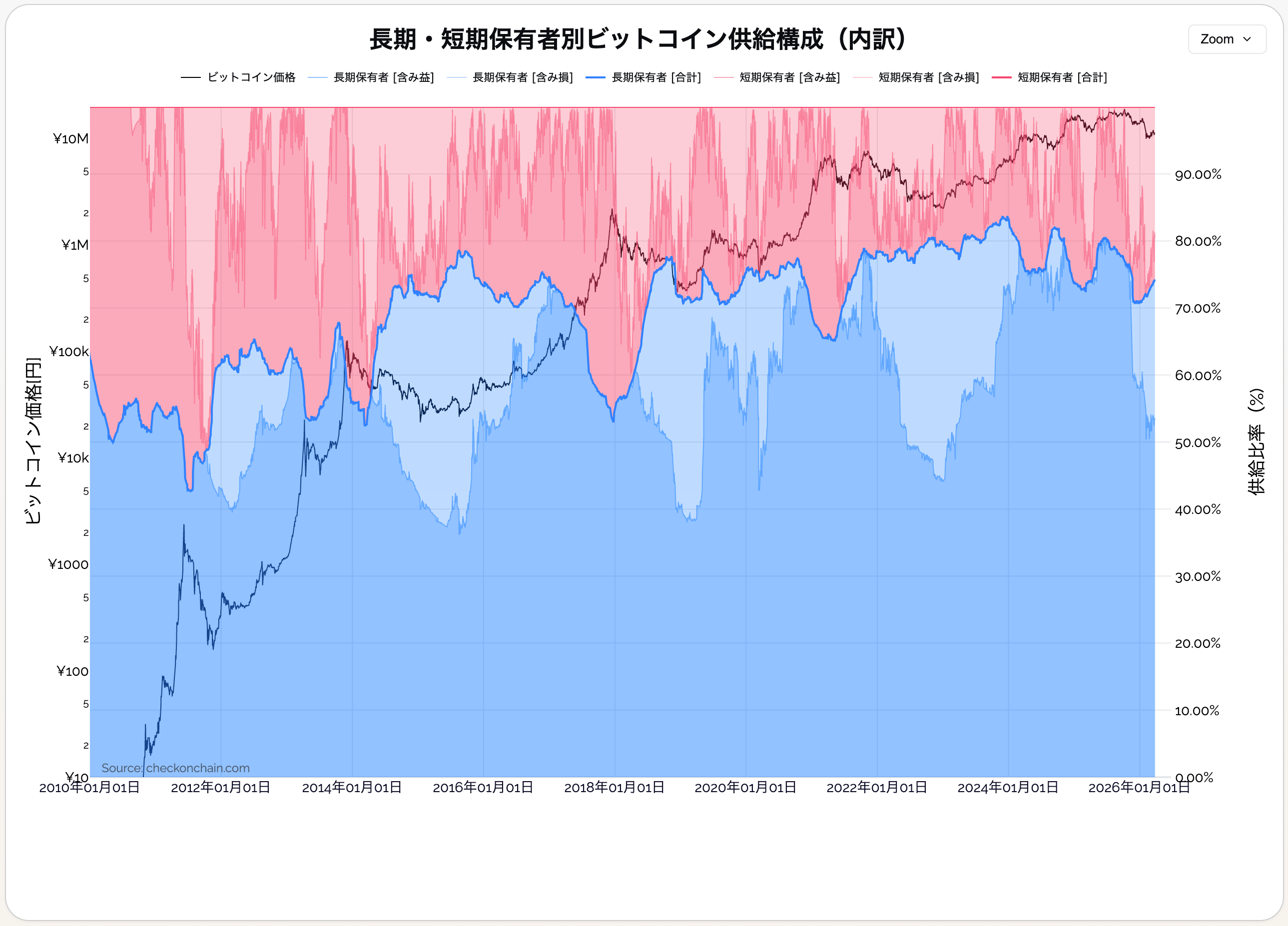 長期保有者(155日超)と短期保有者(155日以内)が保有するビットコインの割合を積み上げグラフで表示。強気サイクルの後半には短期保有者の比率が上昇し、天井圏での分布を示すことが多い。