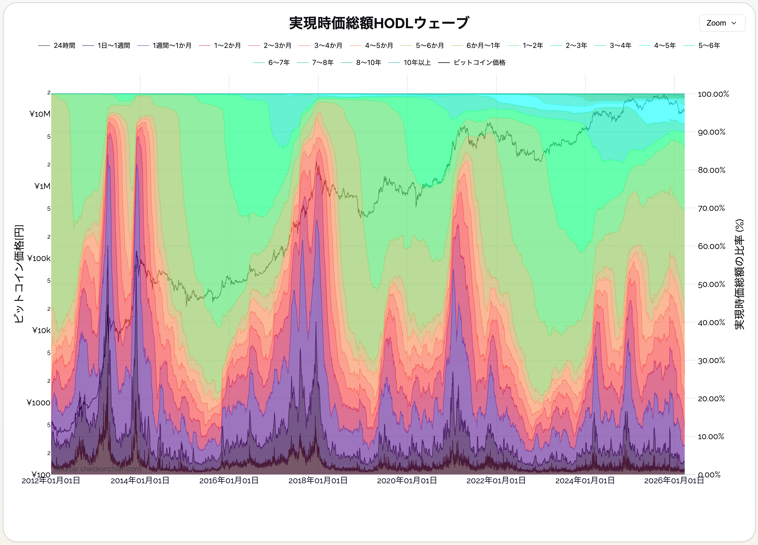 取得からの保有期間別(24時間〜15年以上)に供給量を層別表示した、サイクルの鳥瞰図とも呼べるチャート。強気相場では若い層(短期保有)が拡大し、蓄積フェーズでは古いコインの割合が増加するパターンが読み取れる。