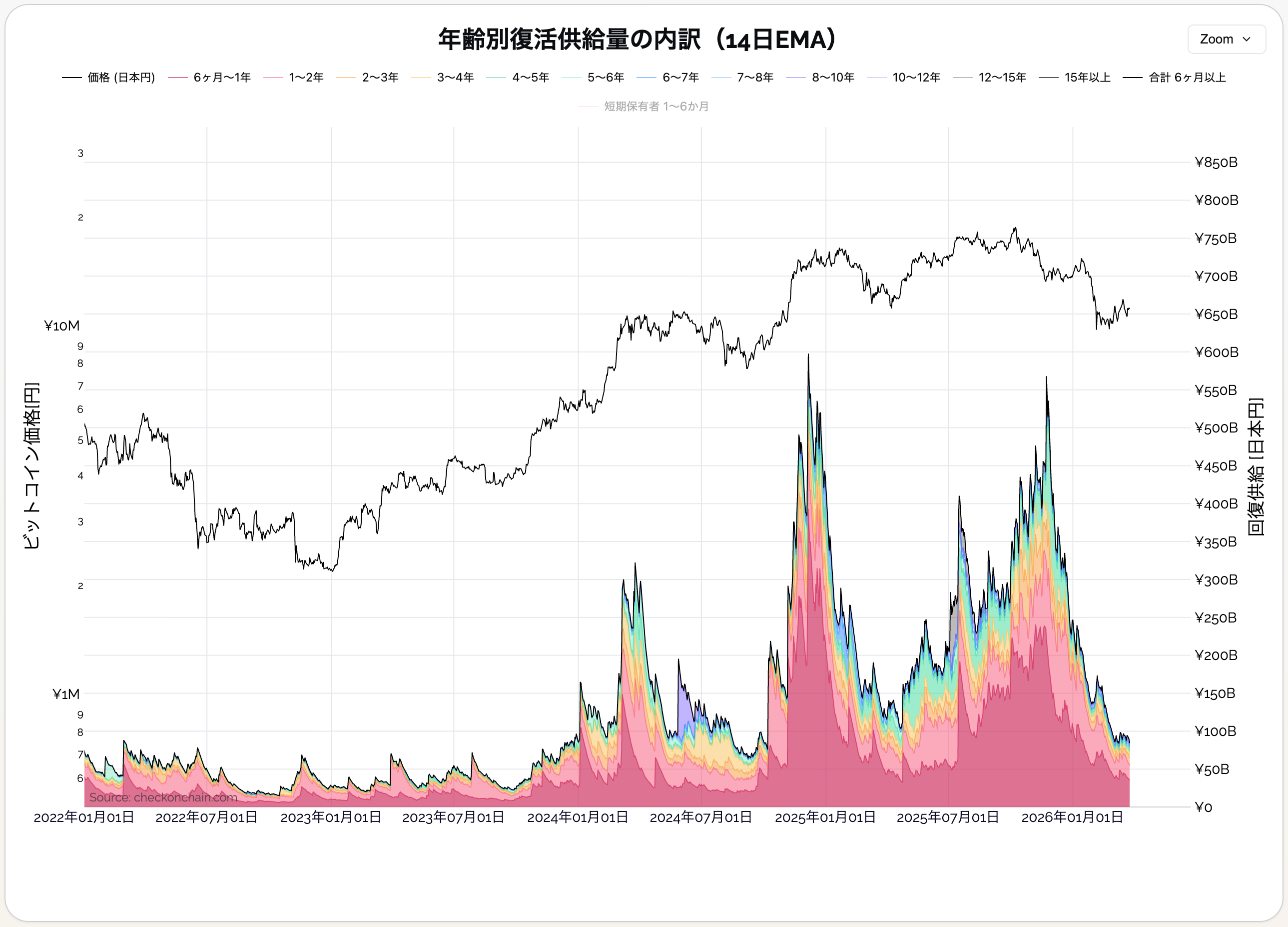 長期間動いていなかったコインが再び動き出した量を、年齢別に分解して表示(14日EMA)。長期保有者が売却に動く局面をとらえる指標で、サイクルの天井圏でスパイクしやすい。