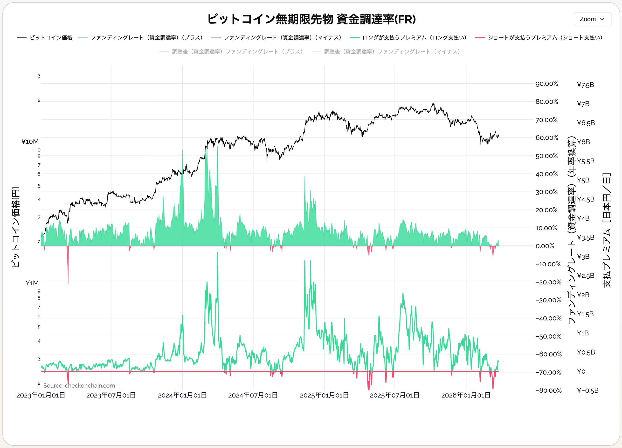 無期限先物の資金調達率。プラスが続く局面はロング過多、マイナス転化はショート優勢を示す。極端な偏りが生じた後に反転するパターンが多く、過熱・調整を判断する際に有効。