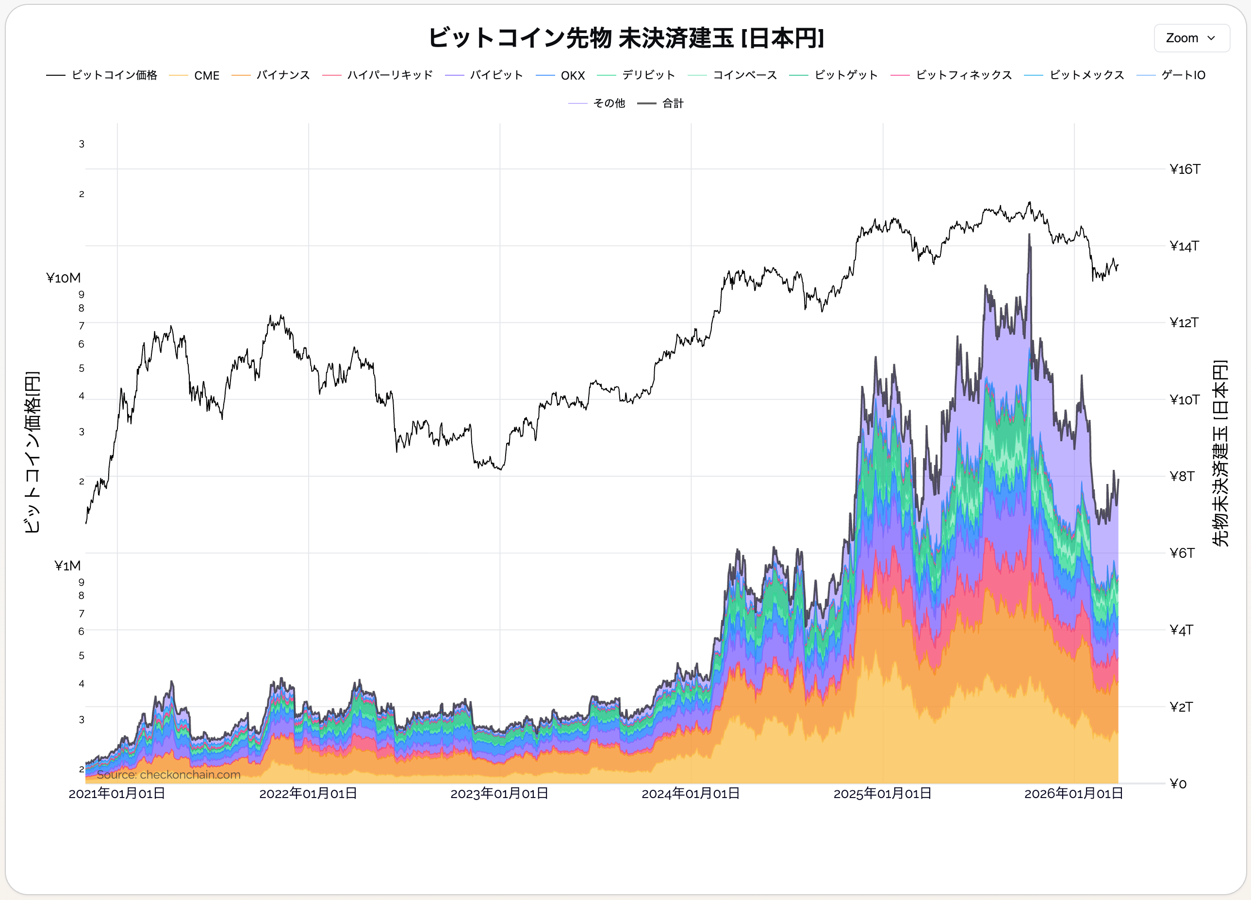 CME、Binance、OKX、Bybitなど主要取引所別の未決済建玉を日本円建てで表示。建玉の急増は価格の大きな動きの予兆となることがある。