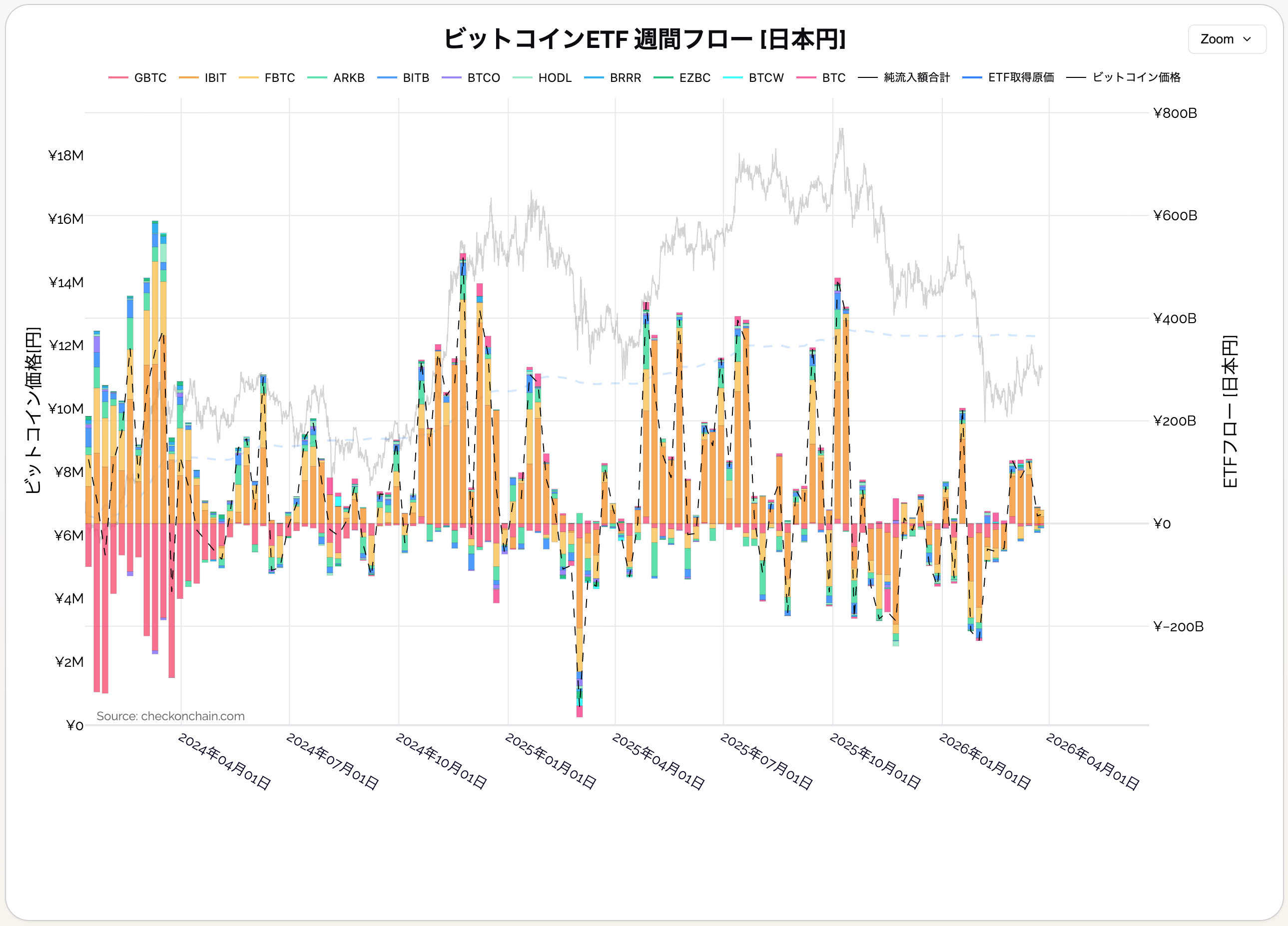 GBTC、IBIT、FBTC、ARKBといった米国の現物ビットコインETF(上場投資信託)への週間資金フローを日本円建てで確認できる。2024年1月のETF承認以降の資金動向が一目でわかり、機関投資家の動向を読むうえで重要な指標。