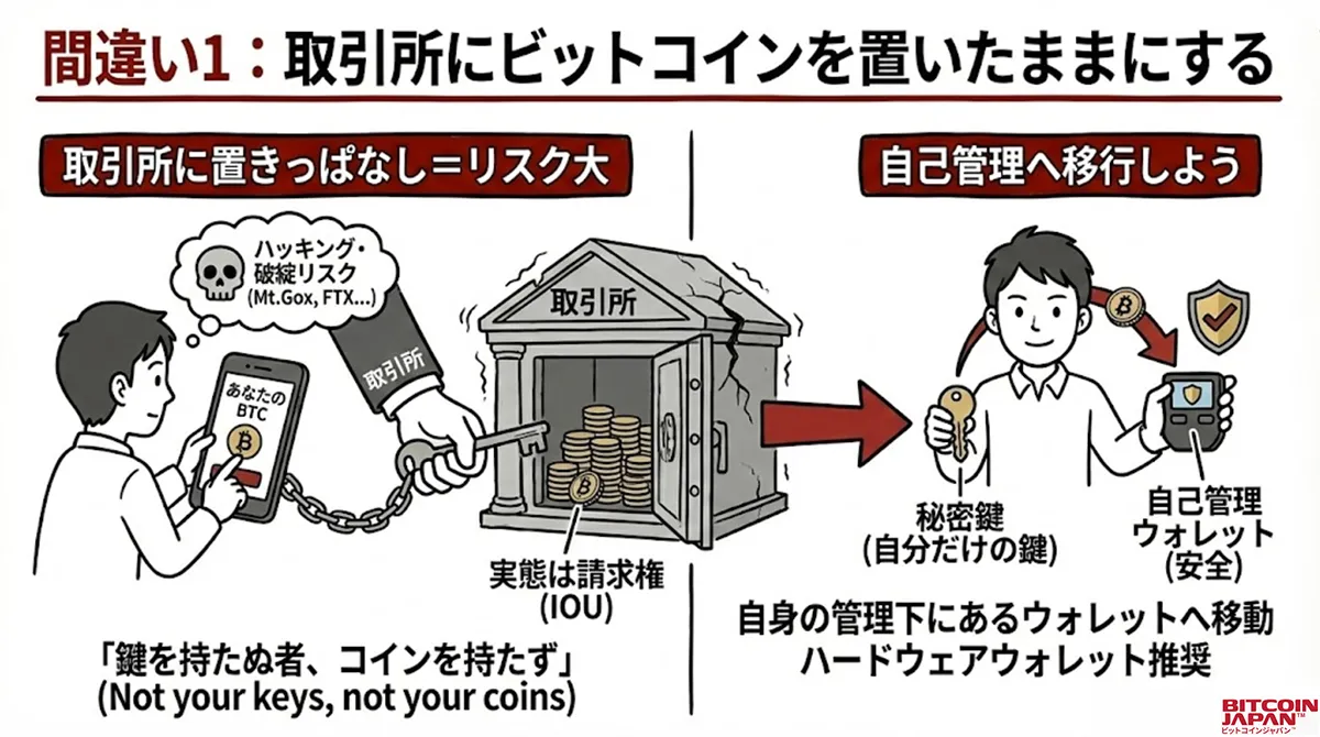 ビットコインには「Not your keys, not your coins(秘密鍵を持たざる者、コインを持たず)」という鉄則があります。取引所で購入したビットコインは、画面上ではあなたのものに見えますが、ブロックチェーン上の実態としては取引所のウォレットに入っています。つまり、あなたはビットコインそのものではなく、「取引所に対する請求権(IOU)」を持っているに過ぎません。