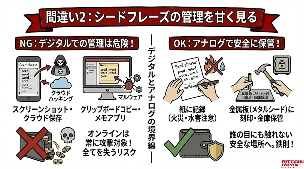 取引所からウォレットへ資金を移したとしても、その後の管理方法を誤れば、全てを失う可能性があります。ここで登場するのが「シードフレーズ(リカバリーフレーズ)」の扱いです。