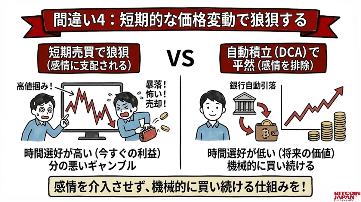 ビットコインの価格は変動します。時には1日で10%以上動くことも珍しくありません。このボラティリティ(価格変動)に耐えられず、高値で飛びつき、安値で売ってしまうのが初心者の典型的なパターンです。