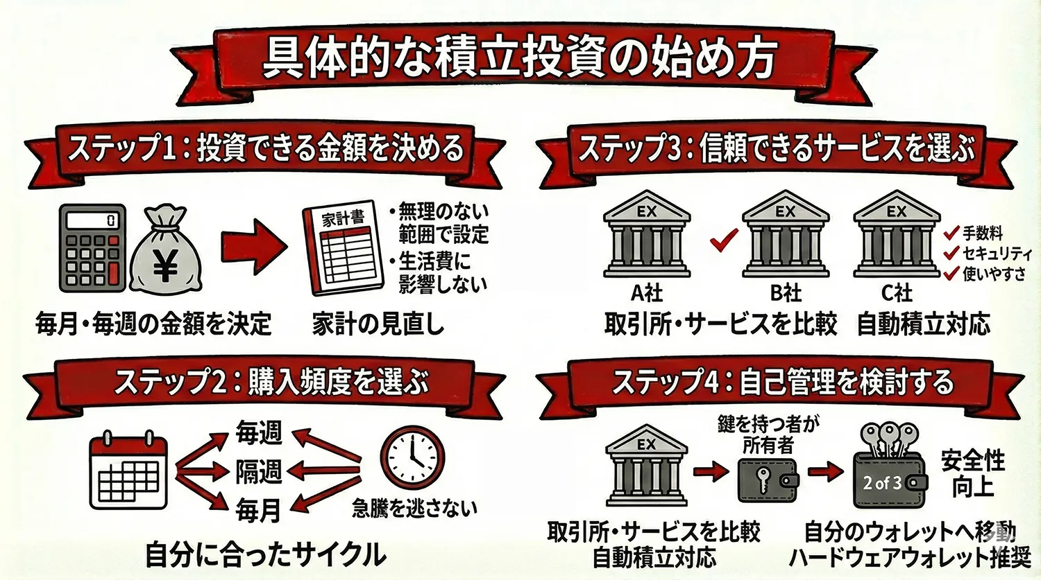 積立投資を実際に始めるには、いくつかの手順があります。無理のない範囲で、段階的に進めることが大切です。
