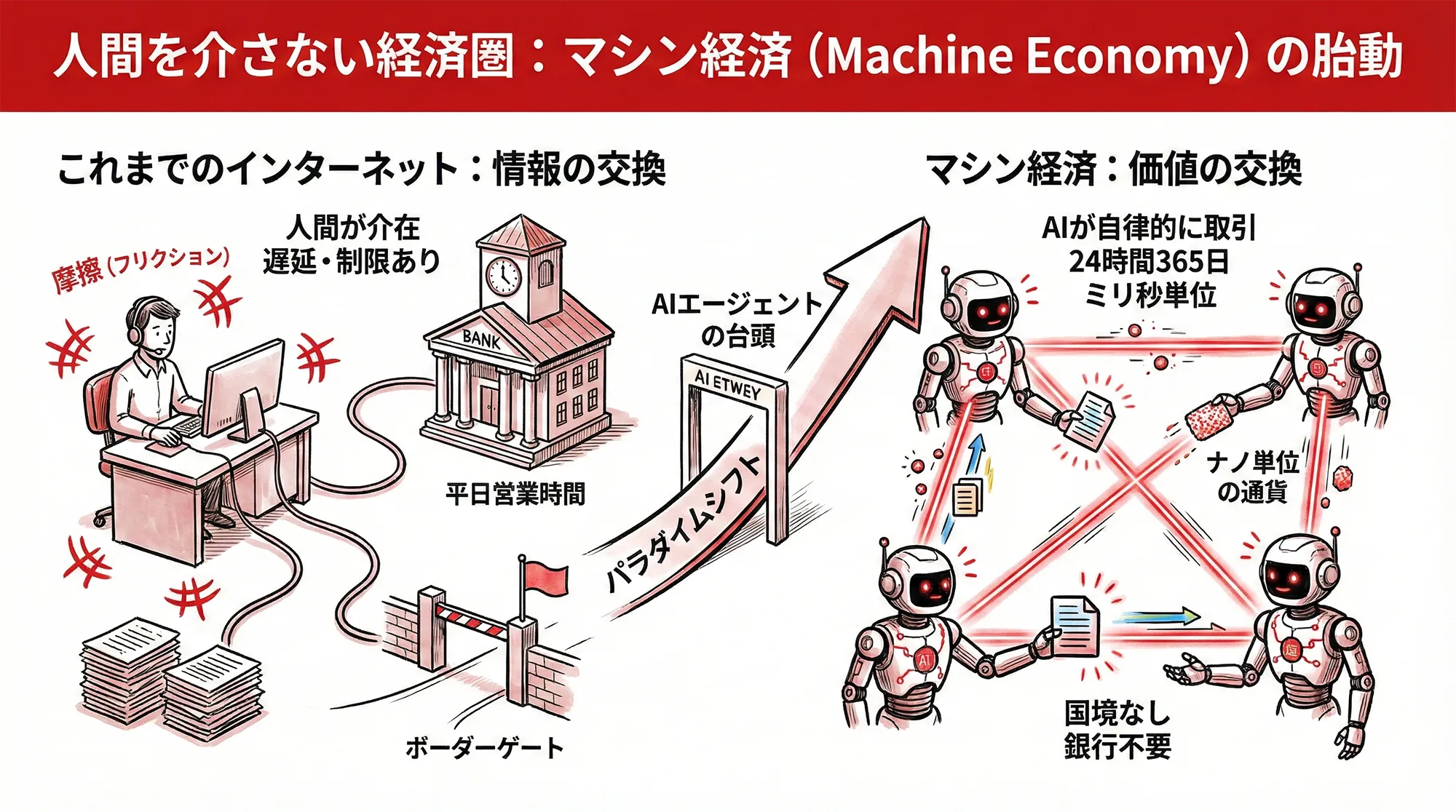 マシン経済(Machine Economy)において、AIは誰の許可も得ず、24時間365日、ミリ秒単位のスピードで取引を行います。そこでは「平日の銀行営業時間」や「国境」という概念は存在しません。AIが別のAIにデータ解析を依頼し、その対価としてナノ単位の通貨を即座に支払う。こうした「マシン間(M2M)の相互作用」によって駆動される経済圏では、人間が仲介する余地はなく、むしろ人間が介在すること自体が摩擦(フリクション)となります。