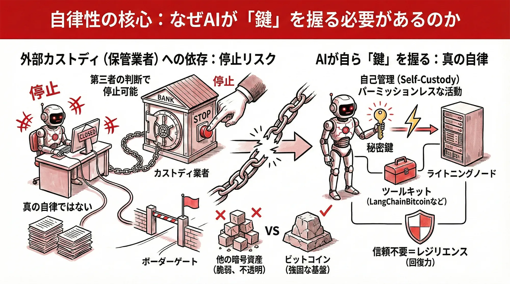 ここで重要になるのが、AIが「誰の管理下にもない資金」を直接扱えるかどうかという点です。もしAIが外部のカストディ(保管業者)を介して決済を行っているなら、そのAIの活動は第三者の判断一つでいつでも停止させられてしまいます。それは真の意味での「自律」ではありません。