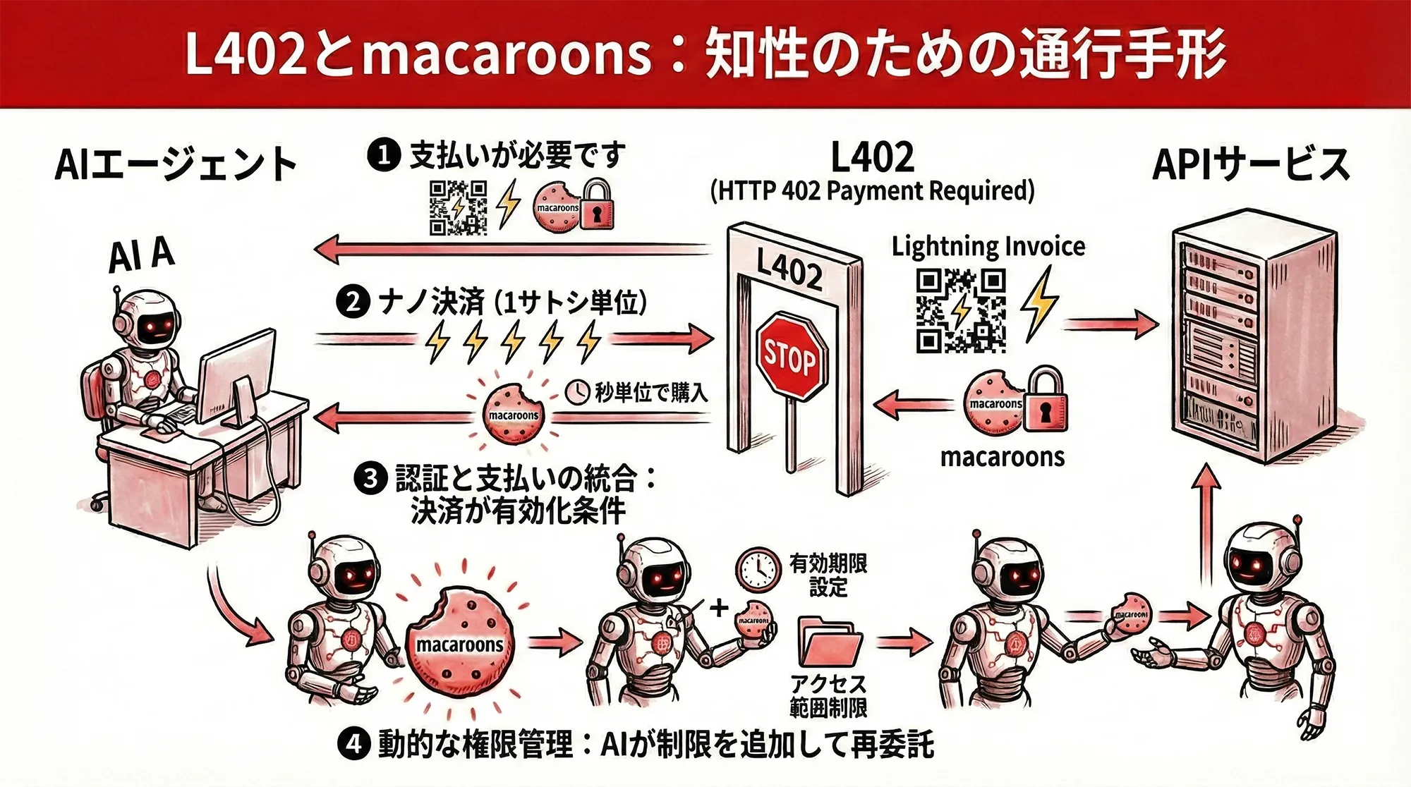具体的にAIがどのようにAPIを売買するのか、その中核を担う技術規格が「L402」です。これはHTTPステータスコードの「402 Payment Required(支払いが必要)」を活用したもので、AIはAPIを利用する際に、認証(macaroons)と支払いを同時に行うことができます。