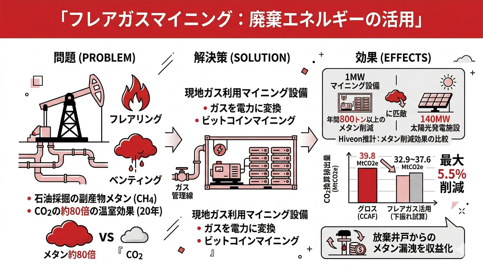 ビットコインマイニング機器をガス田の現地に設置し、本来廃棄されるガスを電力に変換してマイニングに活用する取り組みが世界各地で広がっています。Hiveonの業界推計では、1MWのマイニング設備が活用されれば年間800トン以上のメタンを削減でき、その効果は米国の一般的な140MW太陽光発電施設の排出削減量に匹敵するとされています。