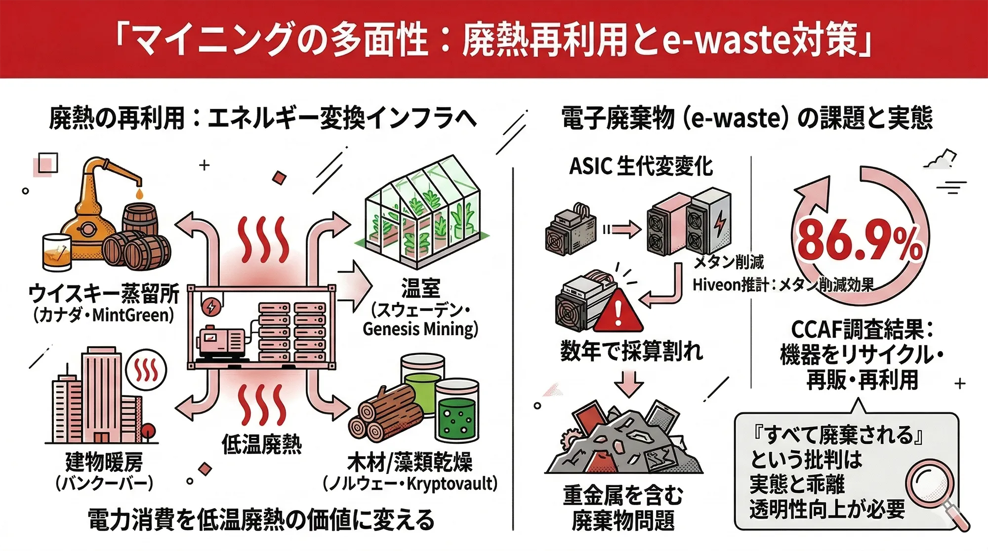 グリーンマイニング議論が電力源に集中しがちな一方で、見落とされやすいのが電子廃棄物(e-waste)の問題です。ビットコインマイニングに使われるASIC(専用集積回路)マシンは技術革新による世代交代が速く、旧世代機は数年で採算割れとなります。旧式化した大量の専用機器が廃棄される場合、重金属を含む廃棄物問題が生じます。