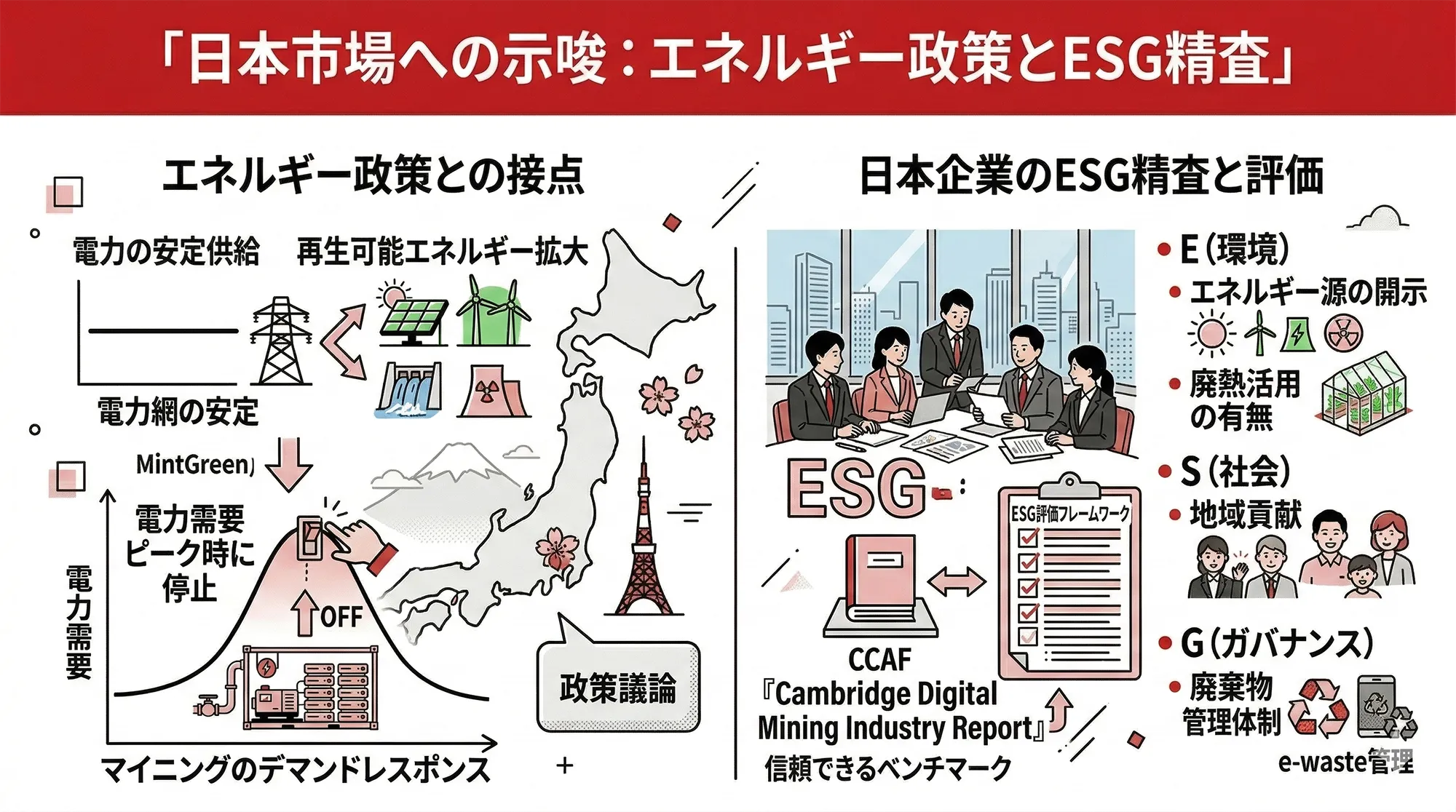 また、日本企業がビットコイン関連の事業・投資を検討する際、ESG(環境・社会・ガバナンス)の観点からの精査は不可欠です。エネルギー源の開示、廃熱活用の有無、廃棄物管理体制——こうした指標を基準に取引先や投資先を評価するフレームワークが今後求められるでしょう。CCAFが毎年公表する「Cambridge Digital Mining Industry Report」は、そのための信頼できるベンチマークとなりえます。