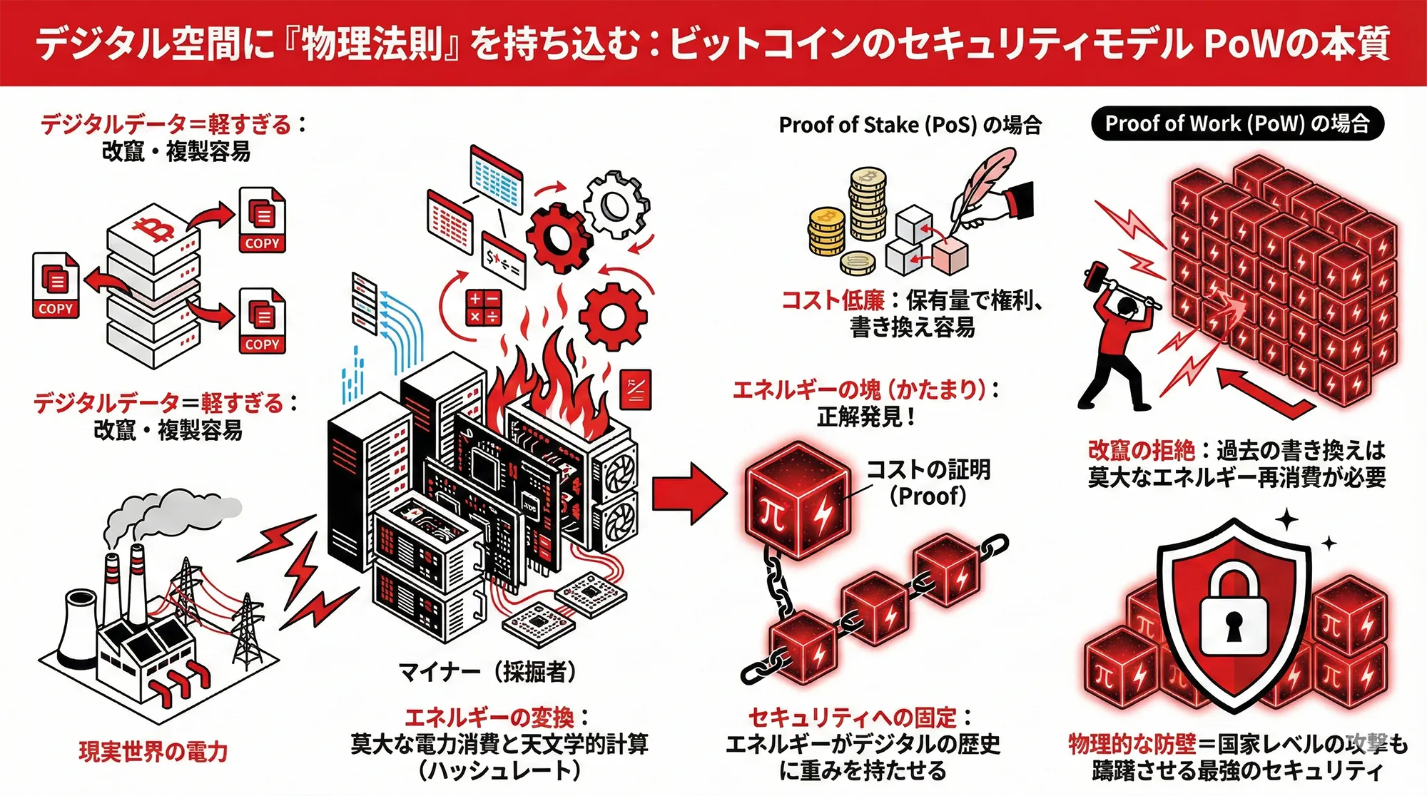 デジタルデータは本来、コストゼロで複製・修正が可能です。この「軽さ」は通貨として致命的です。そこでビットコインは、電力という物理的なリソースを、計算作業(ハッシュレート)を通じてデジタルデータに変換・保存する仕組みを採用しました。