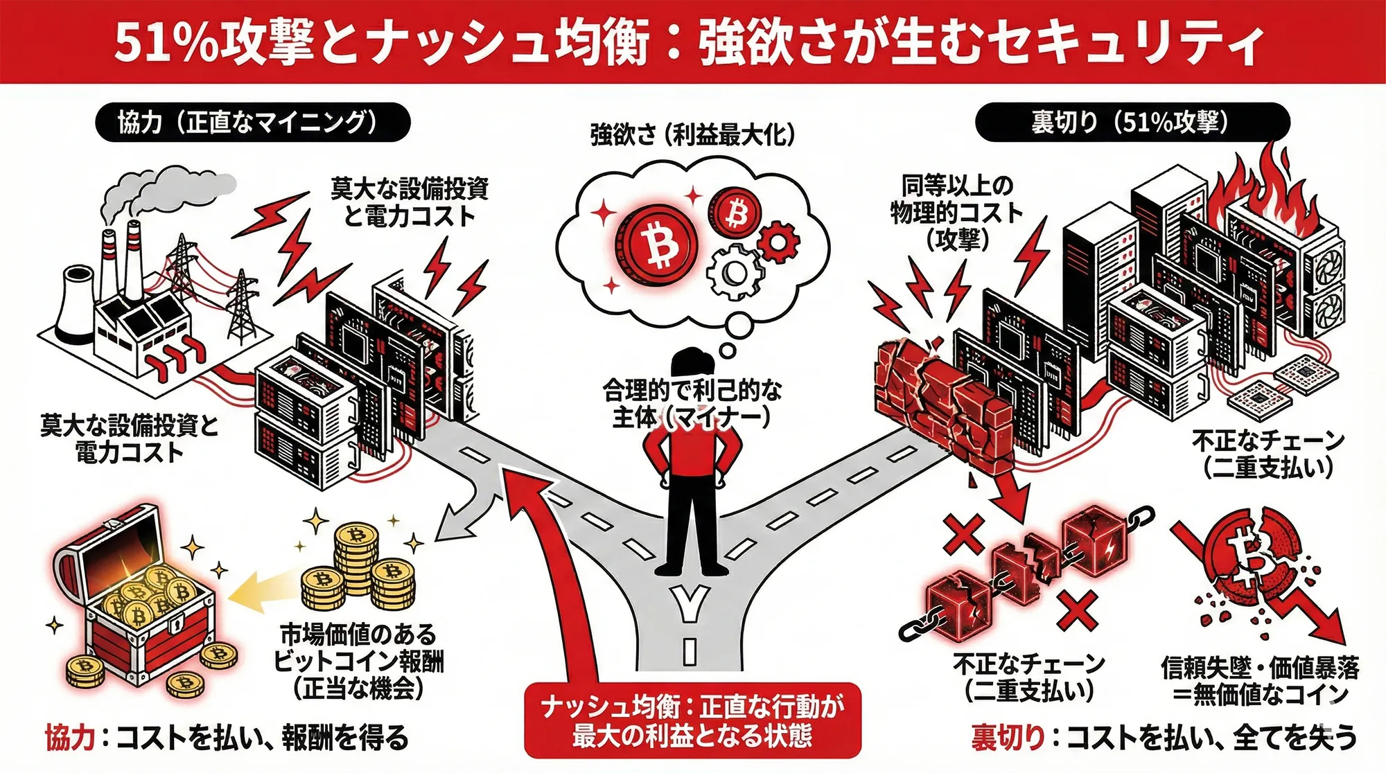 「51%攻撃」はビットコインの潜在的リスクとして頻繁に議論されますが、構造的な本質に目を向ければ、このシステムが攻撃を無力化する「ナッシュ均衡」の状態にあることが理解できます。