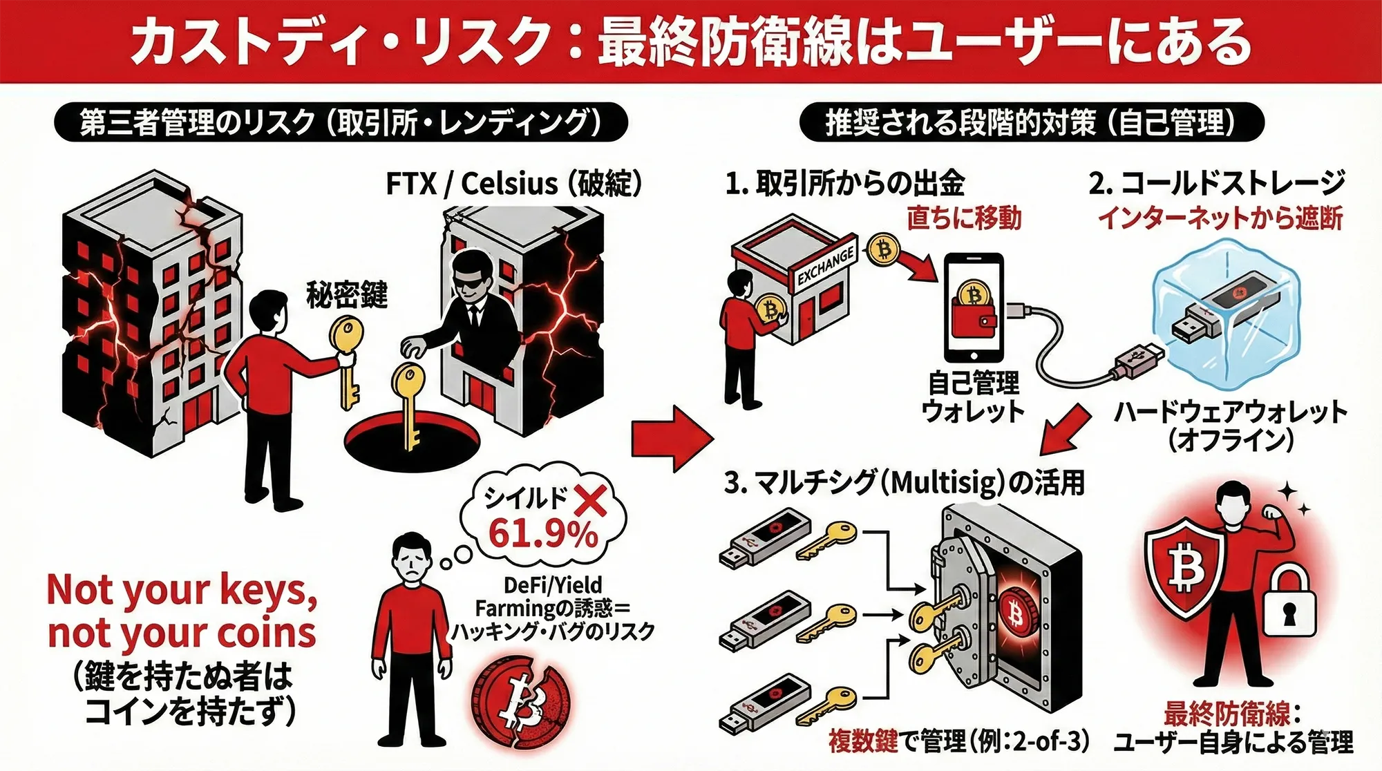 FTXやCelsiusの破綻が証明したように、第三者(取引所やレンディングプラットフォーム)にビットコインを預けることは、セキュリティモデルを根本から否定する行為です。「Not your keys, not your coins(鍵を持たぬ者はコインを持たず)」は単なるスローガンではなく、ビットコインの所有権そのものの定義です。