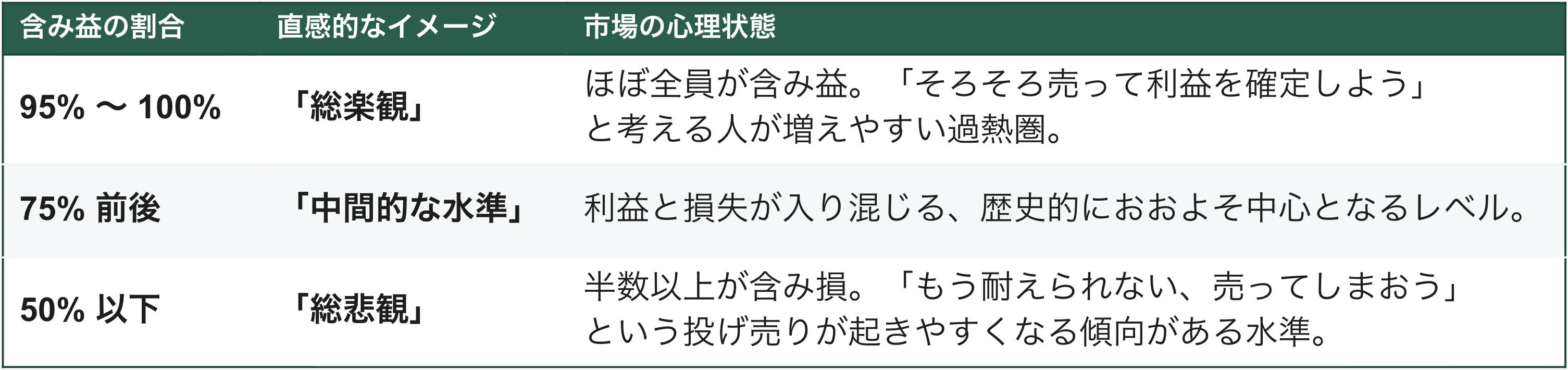 「市場の何割の人がハッピーな状態か」という視点を持つことで、価格だけでは見えない「売り圧力」や「反発の兆し」を推測する手がかりになります。
