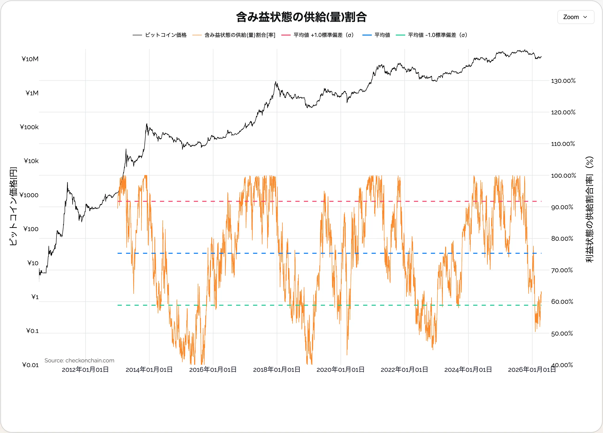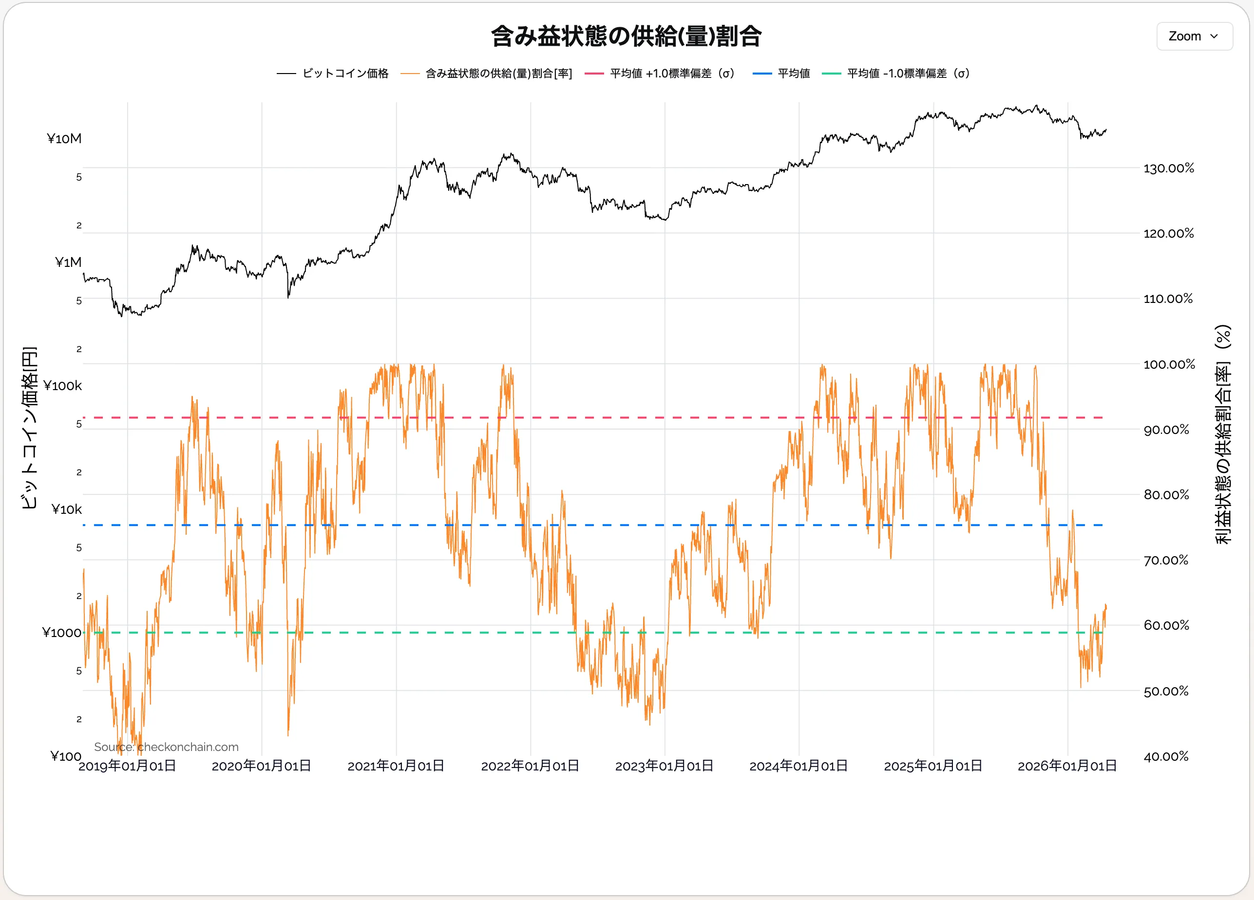 現在、含み益の供給量は60%付近を推移しています。これは青い点線(中間的な水準)を明確に下回り、緑の点線(-1.0σ)に近い水準です。