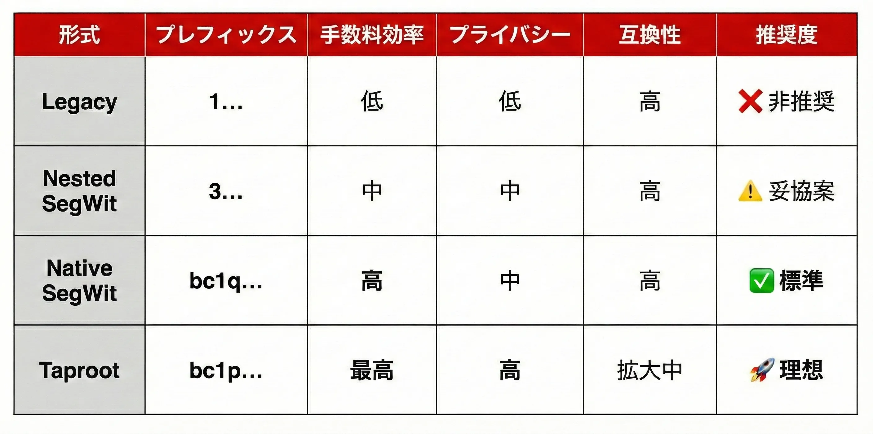 互換性と手数料のバランスが最も取れています。日常的な積立や送金はここへ集約させてください。Taproot (bc1p) への移行: