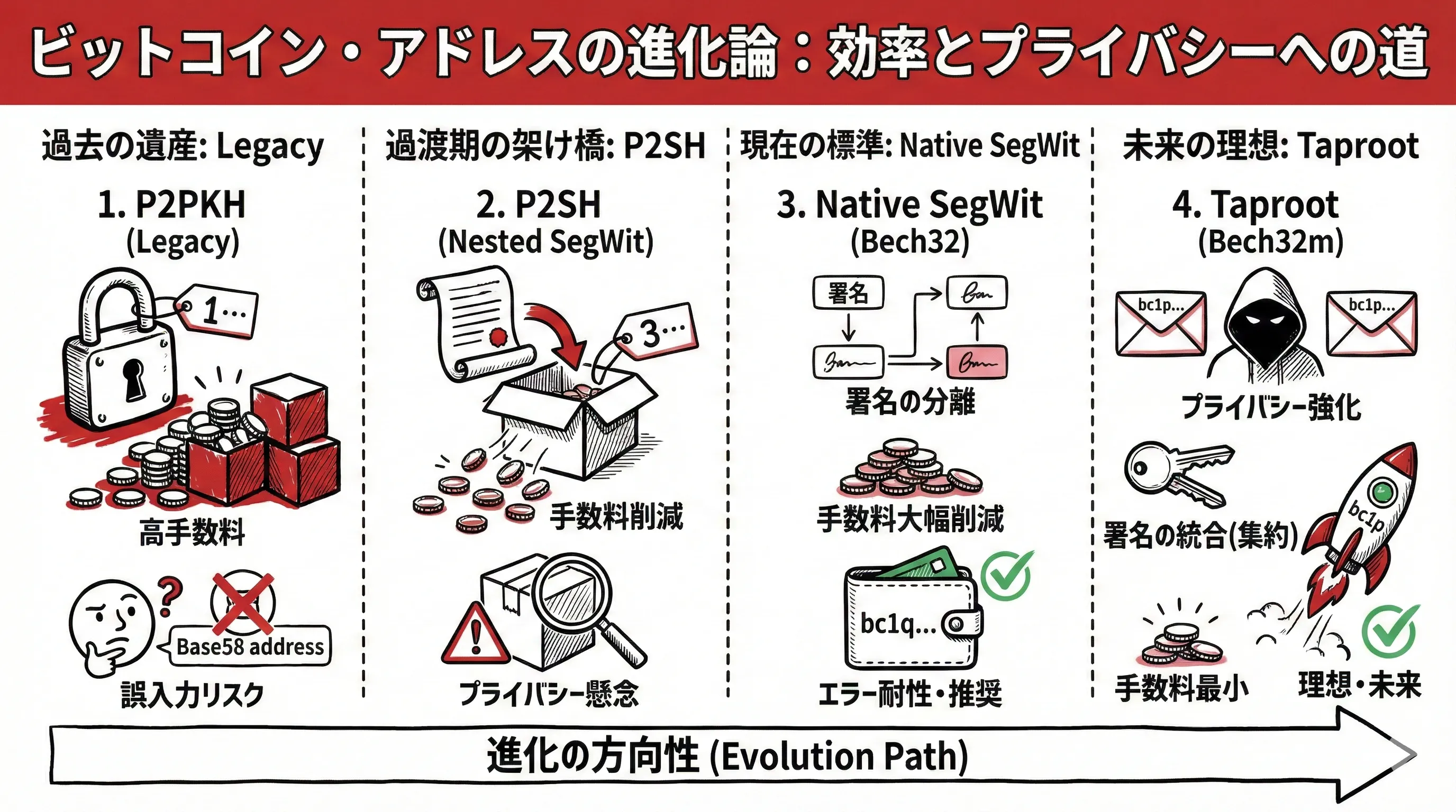 適切なアドレス形式を選択することは、限られたブロックスペースを効率的に利用し、オンチェーンでの足跡(フットプリント)を最小限に抑える行為であり、Proof of Workによって守られたネットワークへの敬意の表れとも言えます。以下、主要なアドレス規格の技術的詳細と、それらが持つ実用的な意味について解説します。
