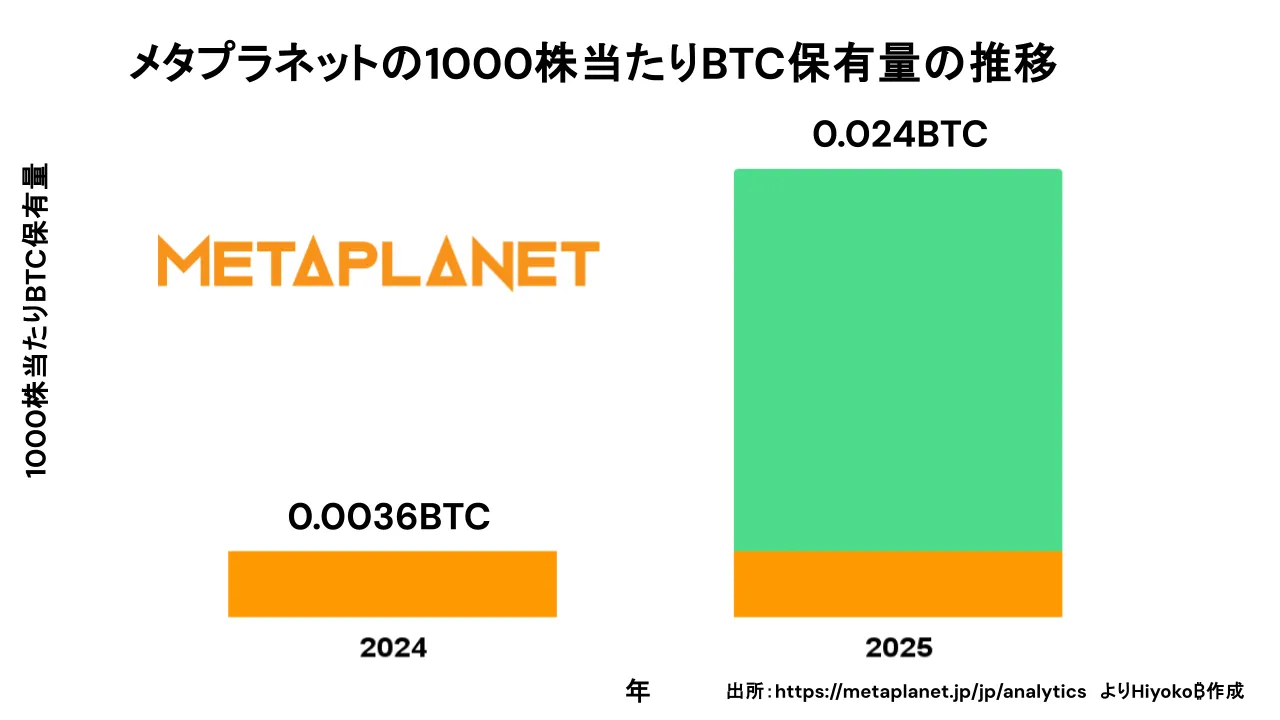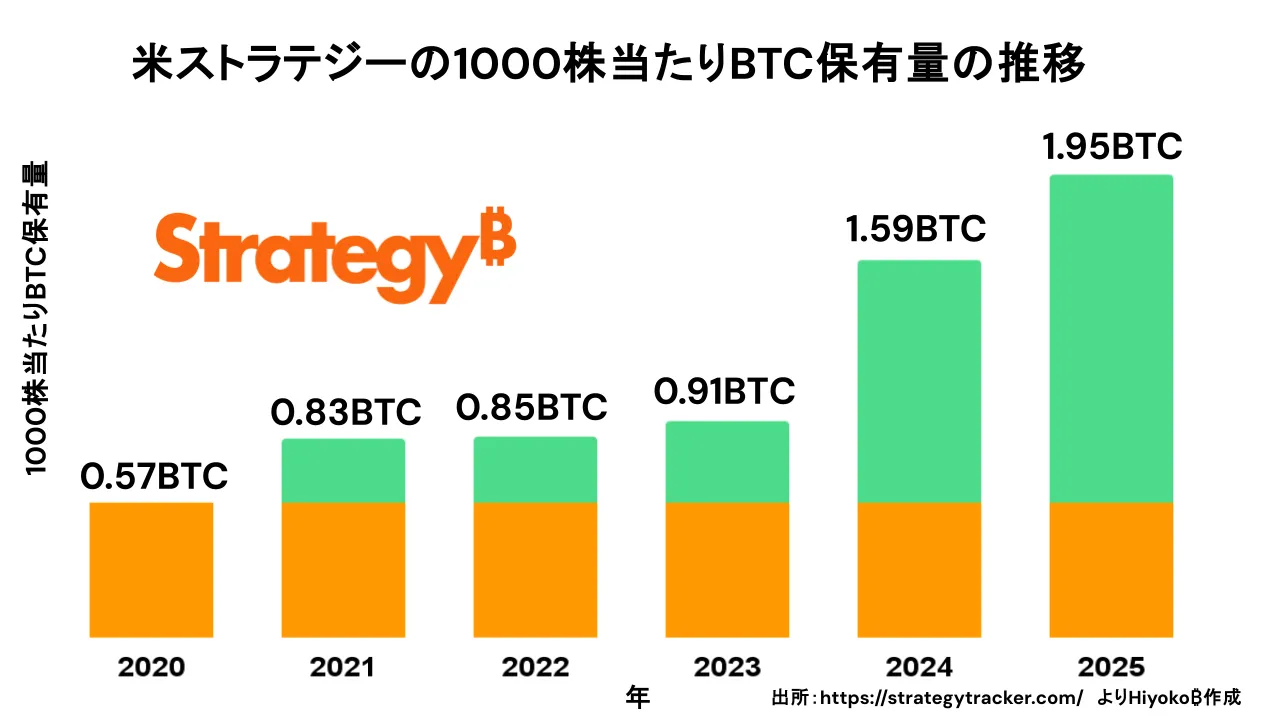 つまり、会社の取り組みによって、保有BTCの増加ペースが株式数の増加ペースを上回る限り、株式を通じた「1株当たりBTC保有量」は増えていく構造が成り立つ、といえます。