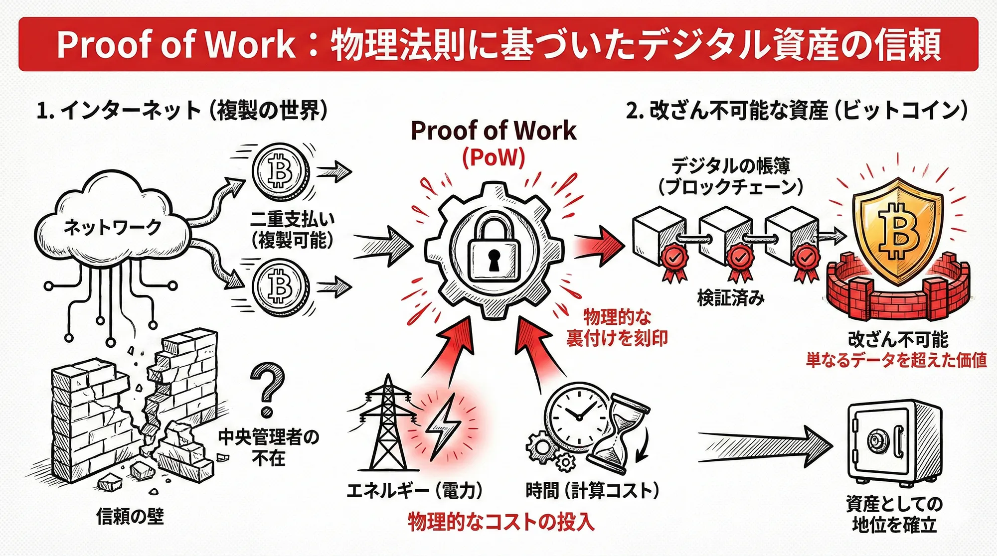 この難題に対するサトシ・ナカモトの回答が、Proof of Work(PoW:作業証明)でした。PoWは、単なるソフトウェアのルールではありません。それは、現実世界の「エネルギー」と「時間」という、誰にも偽造できない物理的なコストをデジタルの帳簿に直接刻み込む仕組みです。この「物理的な裏付け」があるからこそ、ビットコインは単なるデータを超え、改ざん不可能な資産としての地位を確立しました。