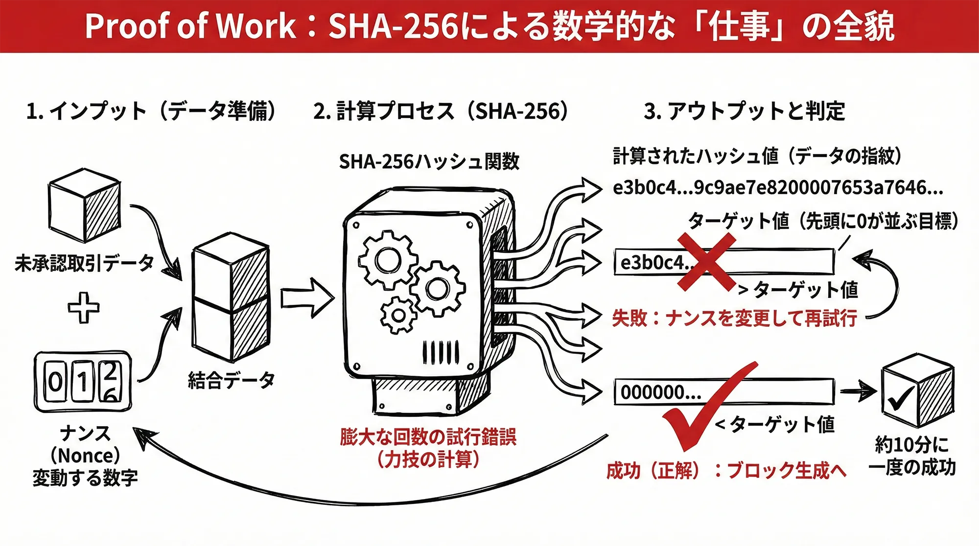 2. 具体的なメカニズム:SHA-256による数学的な「仕事」