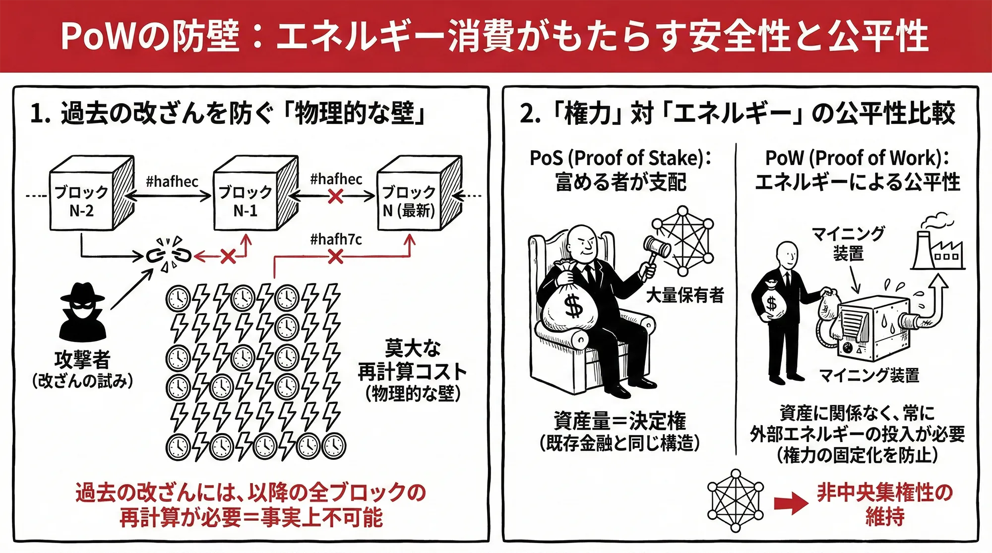 Proof of Stake(PoS)を採用する多くのアルトコインは、コインを多く持つ者に決定権を委ねます。これは既存の金融システムと同じ「富める者が支配する」構造への退行です。一方でPoWは、どれだけ資産を持っていても、常に外部のエネルギーを消費して「仕事」をし続けなければルールに干渉できません。この物理的な制約が、権力の固定化を防ぎ、ネットワークの非中央集権性を維持しています。