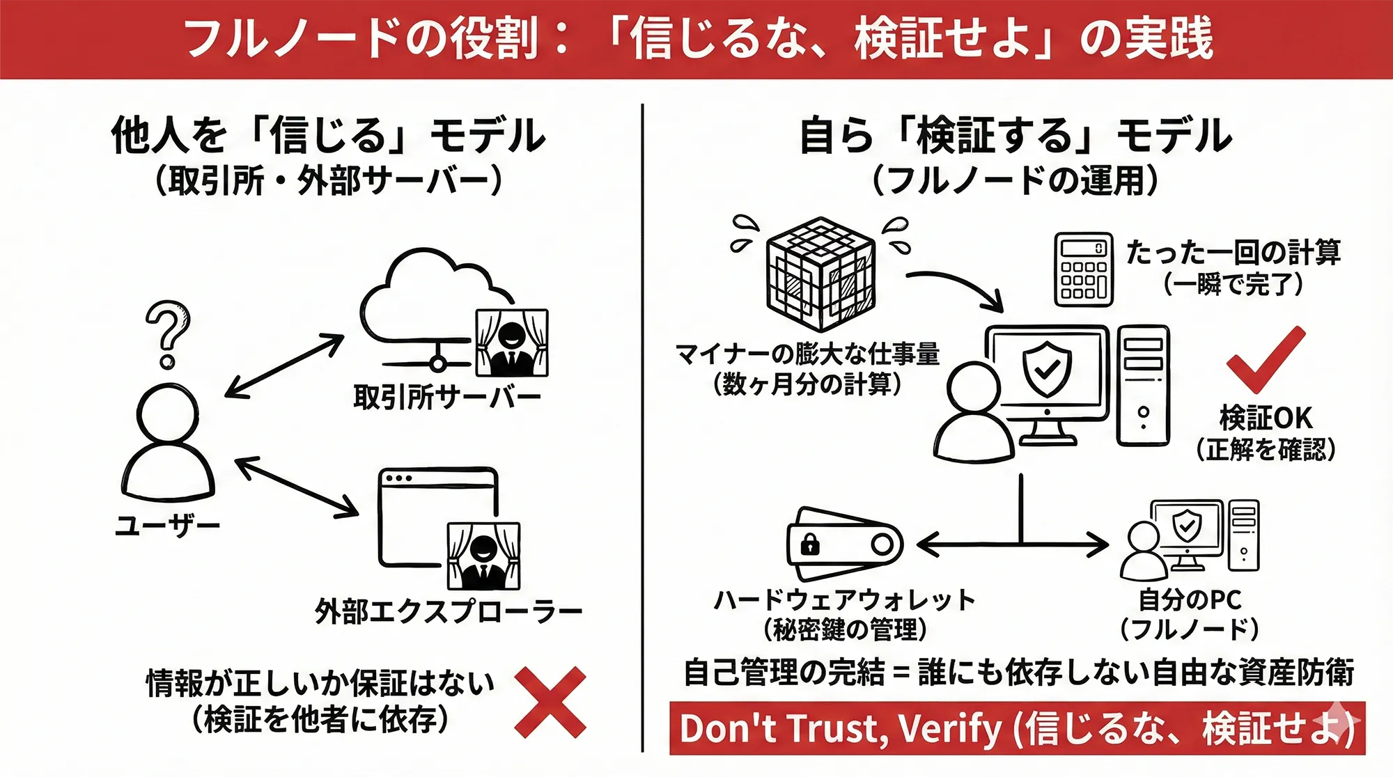 「信じるな、検証せよ (Don’t Trust, Verify)」の実践: 取引所や他人のサーバーの情報を信じるのではなく、自分のフルノードでPoWの有効性を確認すべきです。これこそが、ビットコインが提供する「誰にも依存しない自由」の本質です。