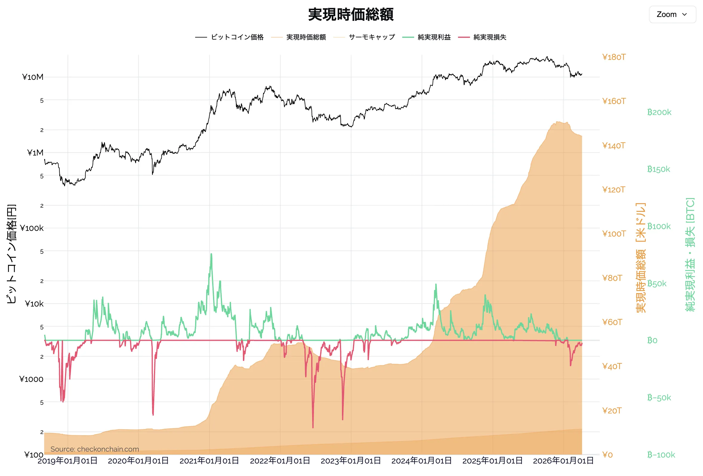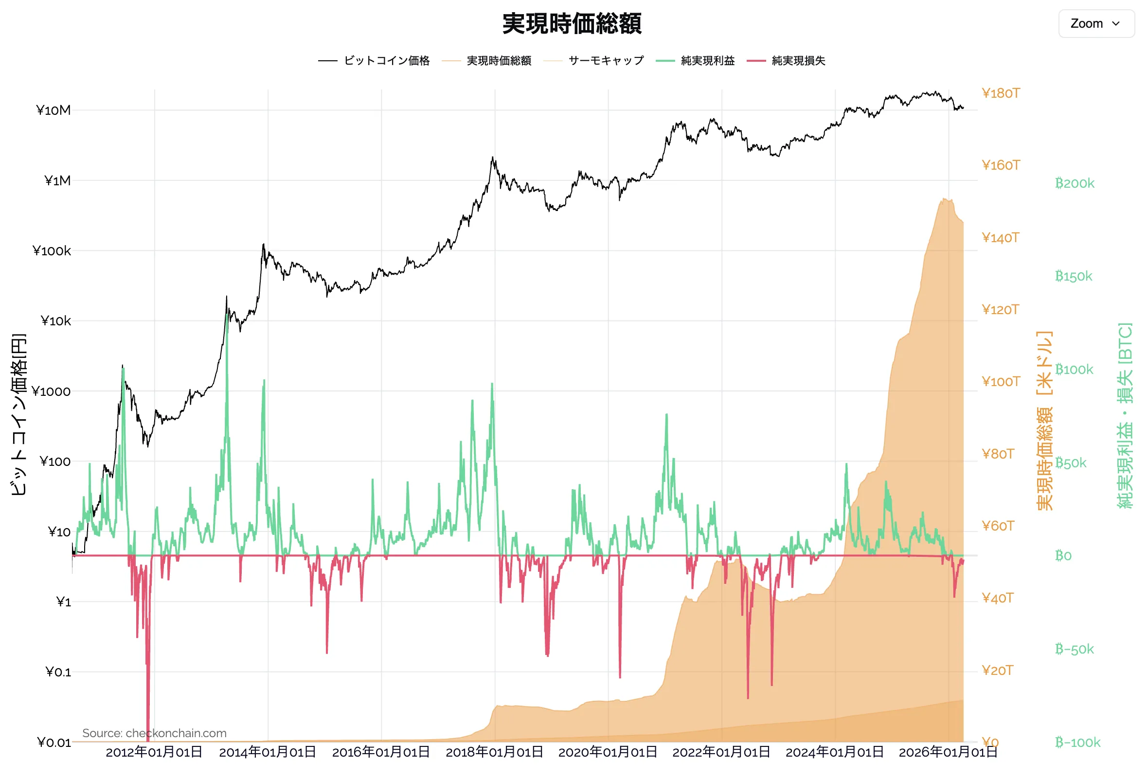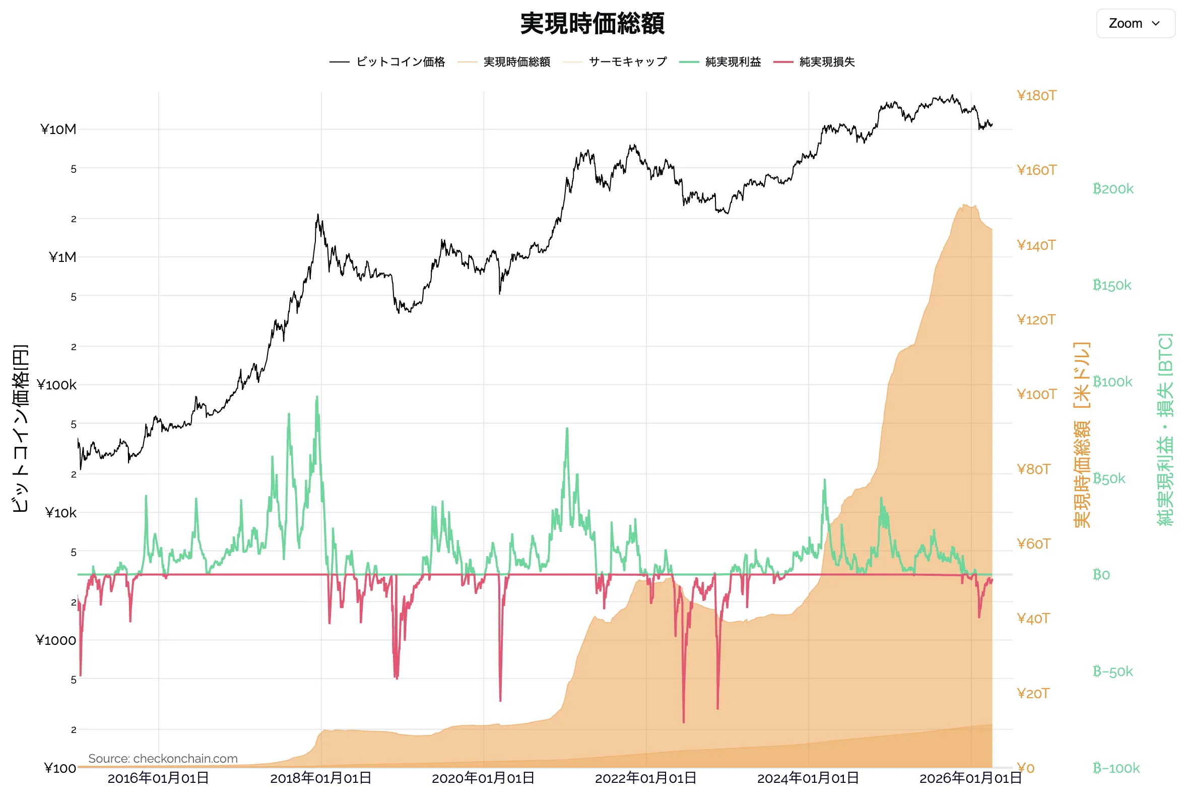 このことから、価格変動の中でコインの保有主体が入れ替わりつつ(世代交代)、ネットワーク全体のコストベースが再構築されている局面と考えることができます。価格が上下しても実現時価総額が維持されていれば、ネットワーク全体としての資本の積み上がりが、引き続き維持されている可能性を示唆しています。