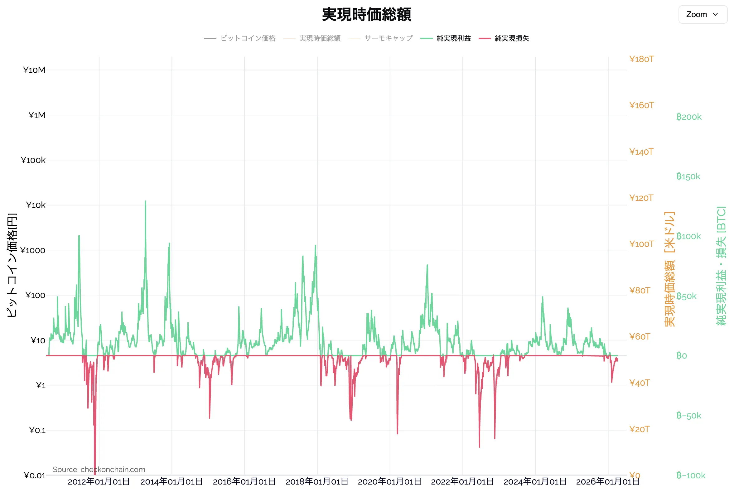 純実現損失(赤)がやや増加している:損失確定を伴うコインの移動が増えている可能性があります。