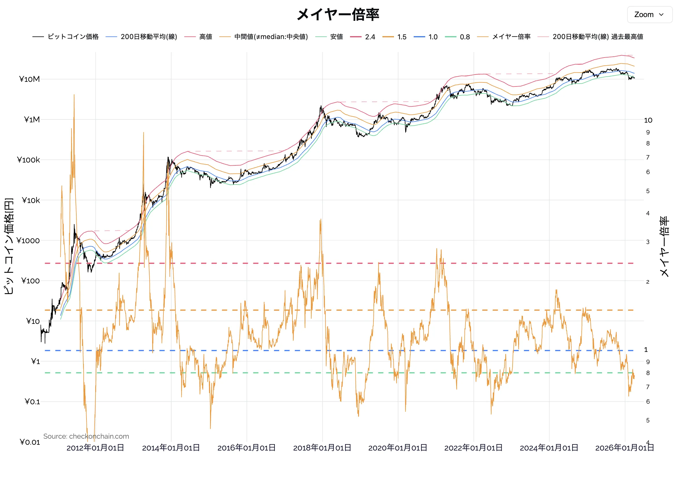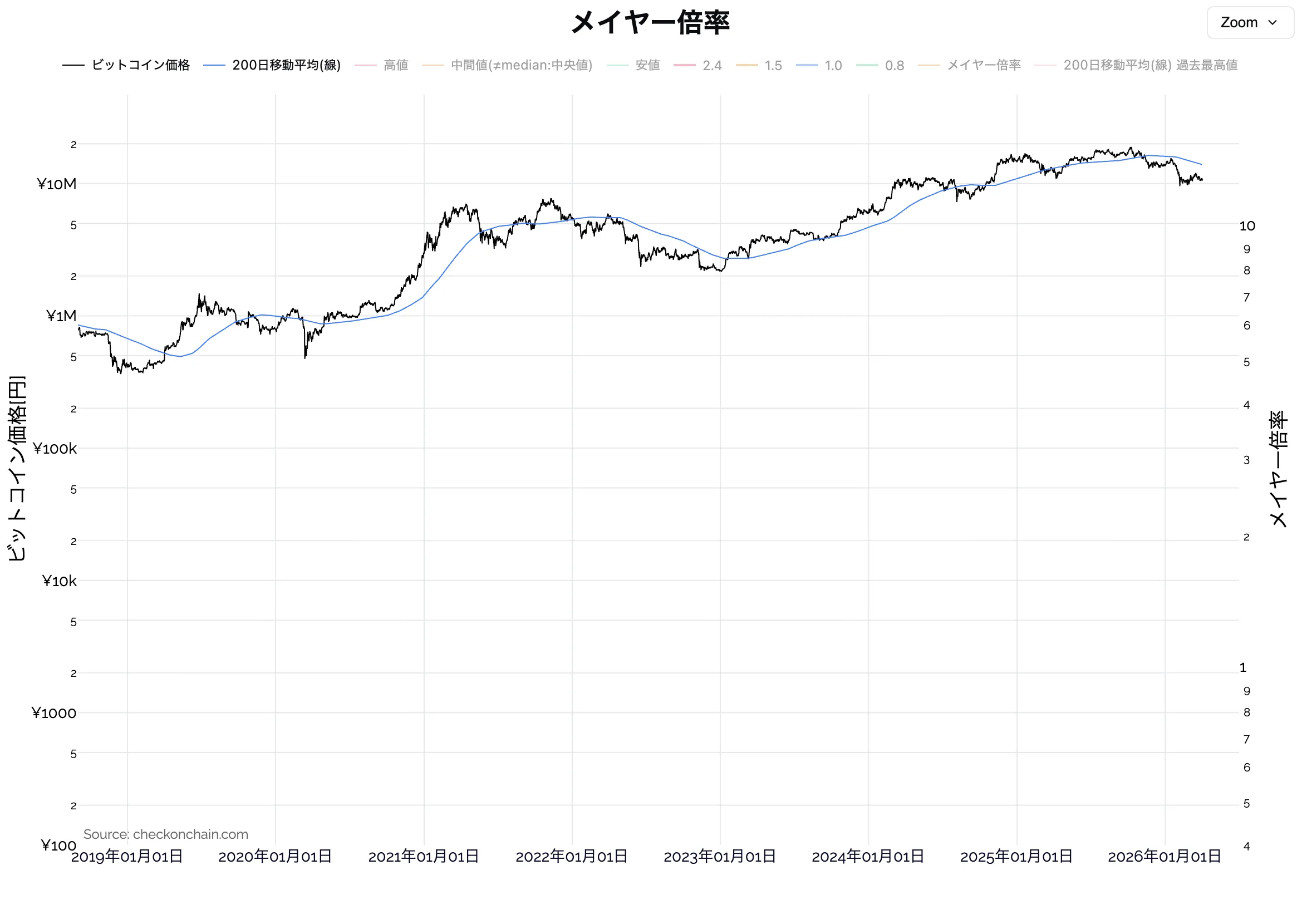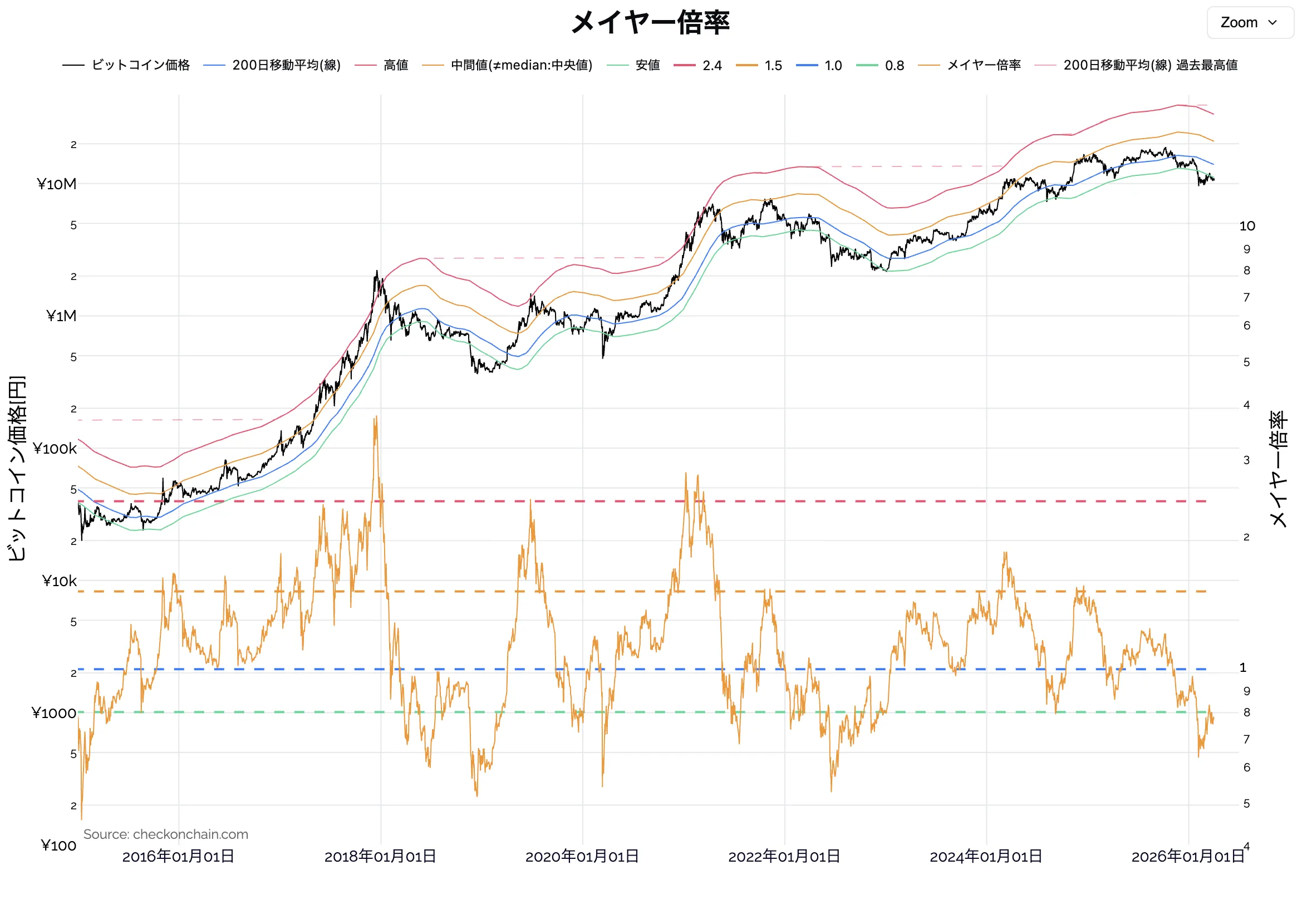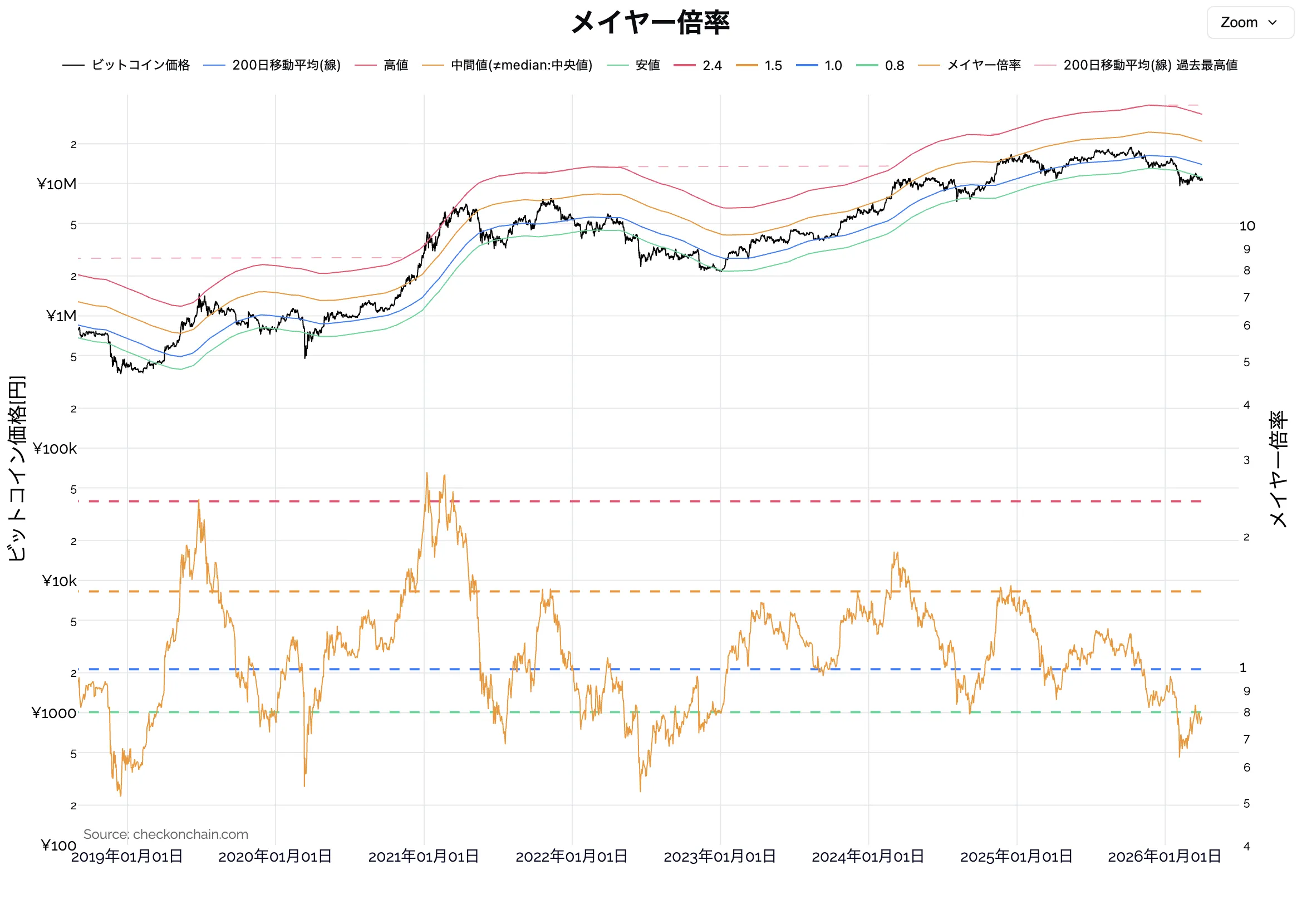 2026年4月現在、ビットコイン価格(黒い線)は、青い200日移動平均線を少し下回る位置にあります。これに伴い、下のメイヤー倍率は緑色の点線(0.8)付近まで低下しています。