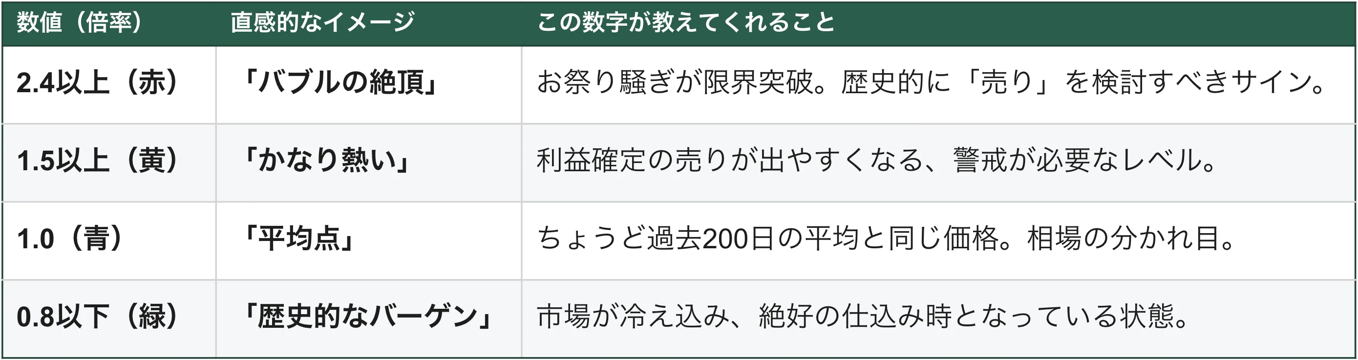 第1回でご紹介した「価格モデル」が市場の全体像を把握するための地図だとすれば、このメイヤー倍率は、相場の過熱感を測る体温計。使い方は驚くほどシンプルです。